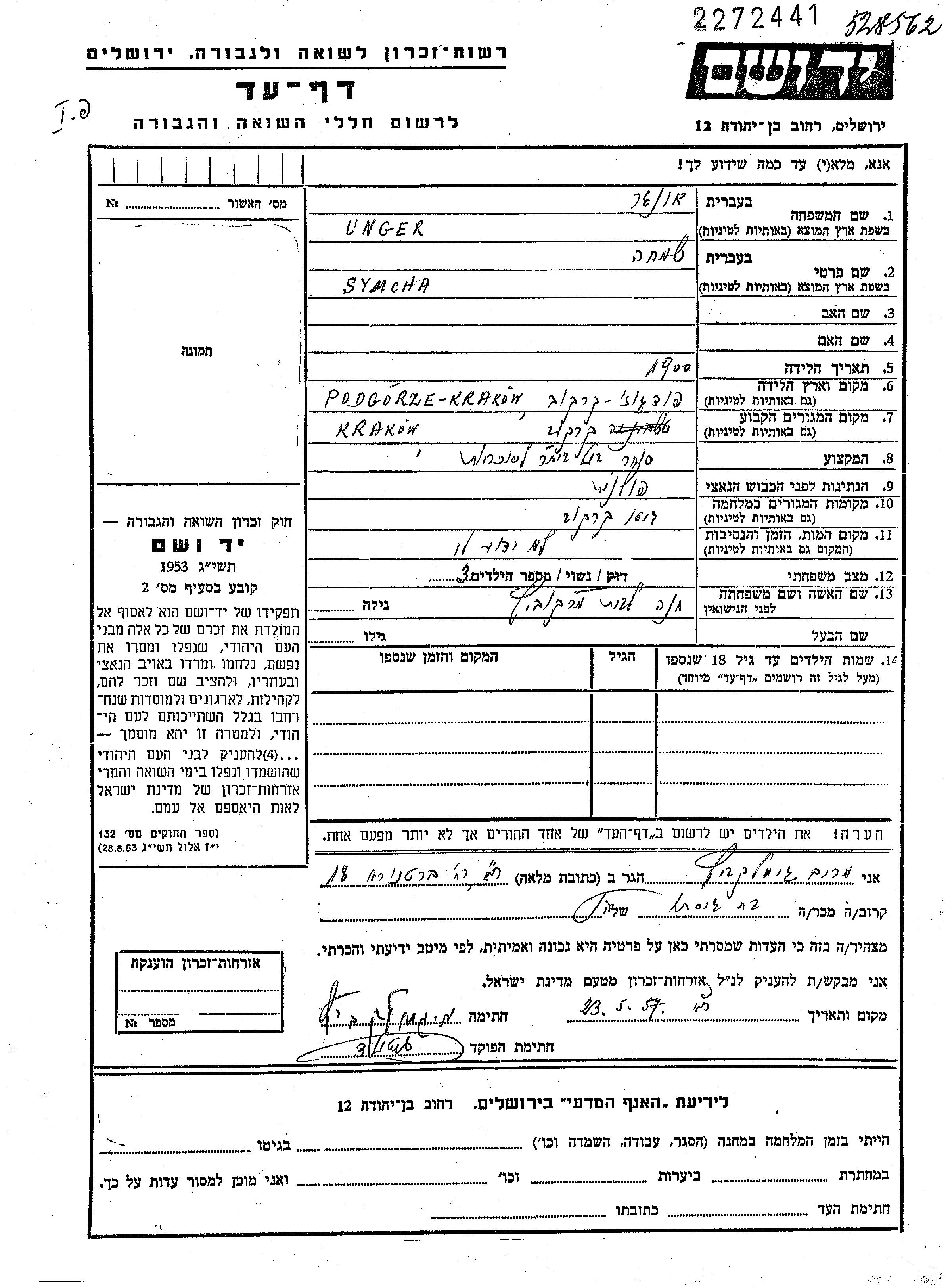 Unger Symcha 1900 Krakow, Poland Page of Testimony