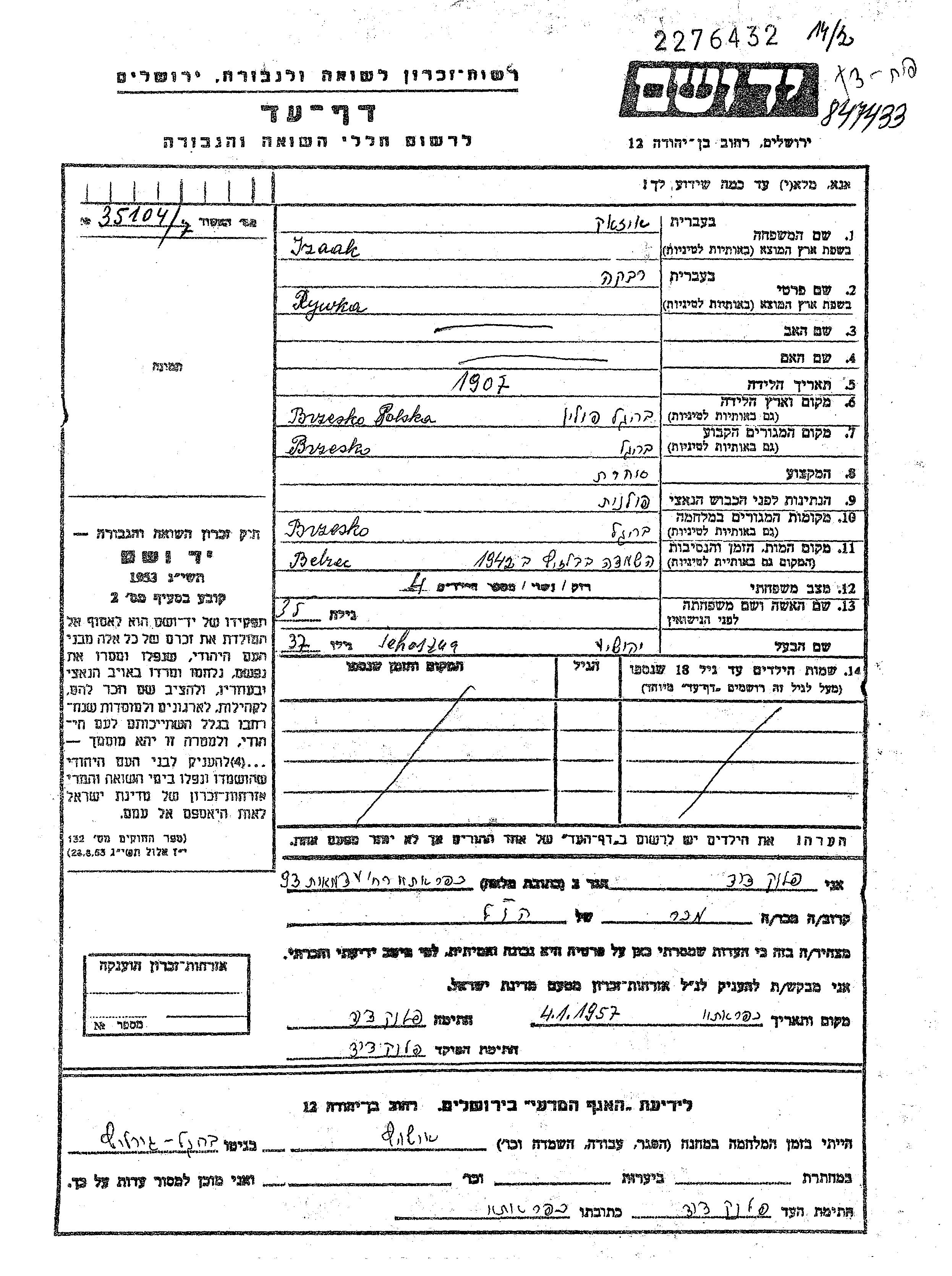 Izaak Izak Rywka 1907 Brzesko, Poland Page of Testimony