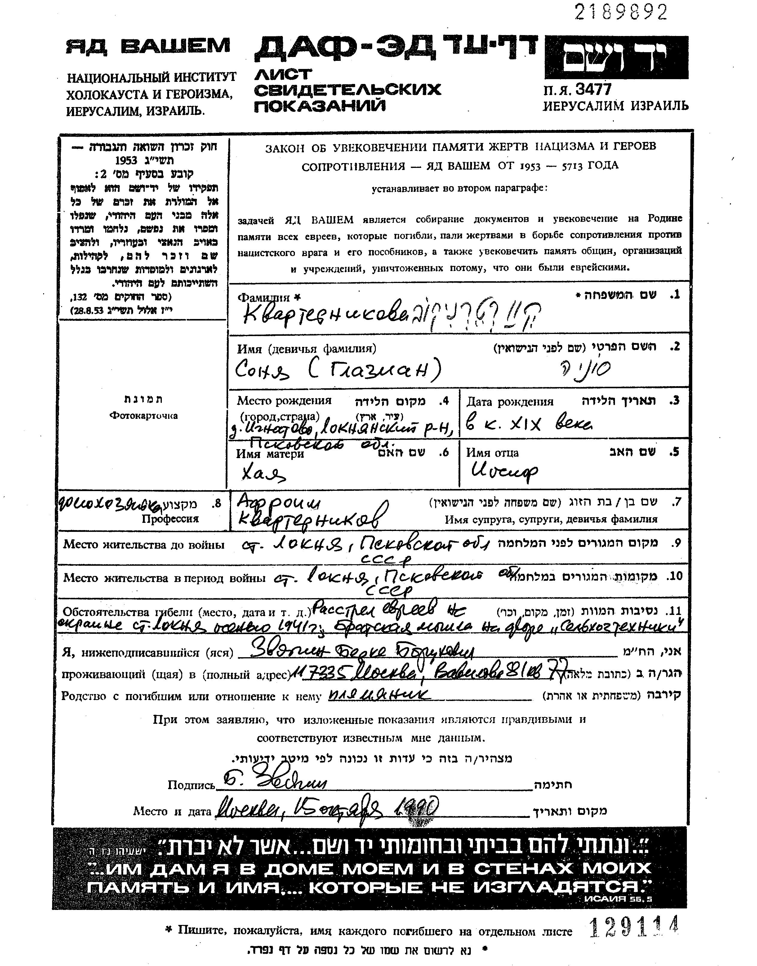 Sonia Kvarternikov nee Glazman was born in Ignatovo, Russia (USSR), 1919 to Yosif and Khaia. She was a housewife and married to Afroim. Prior to WWII she lived in Loknya, Russia (USSR). During the war she was in Loknya, Russia (USSR). Sonia was murdered in the Shoah. Place of death: Loknya, Russia (USSR), 1941.