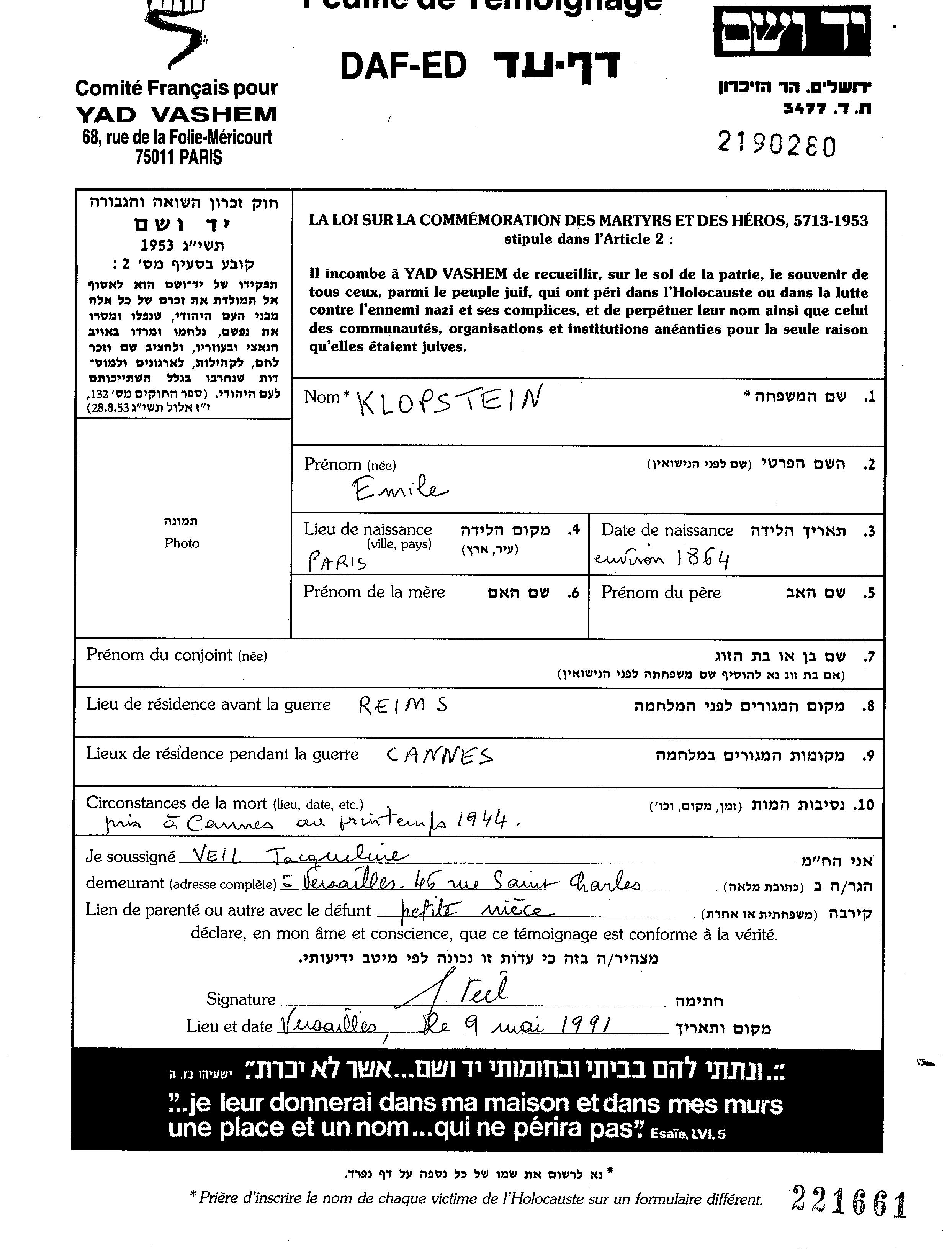 Klopstein Emile 1864 Reims, France Page of Testimony