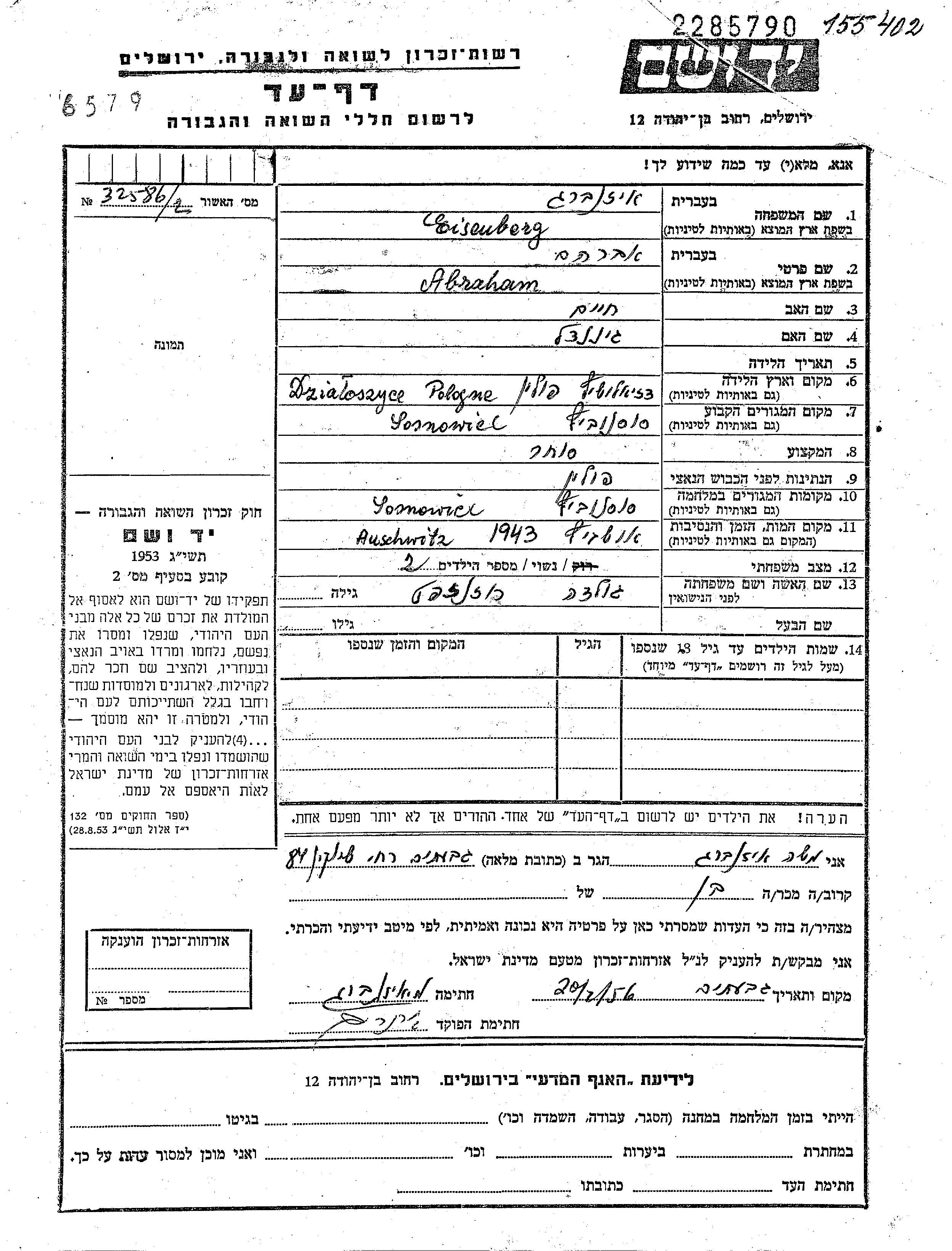 Abraham Eisenberg was born in Dzialoszyce, Poland to Khaim and Ginendl. He was a merchant and married to Golda. Prior to WWII he lived in Sosnowiec, Poland. During the war he was in Sosnowiec, Poland. Abraham was murdered in the Shoah. Place of death: Auschwitz, Poland, 1943.