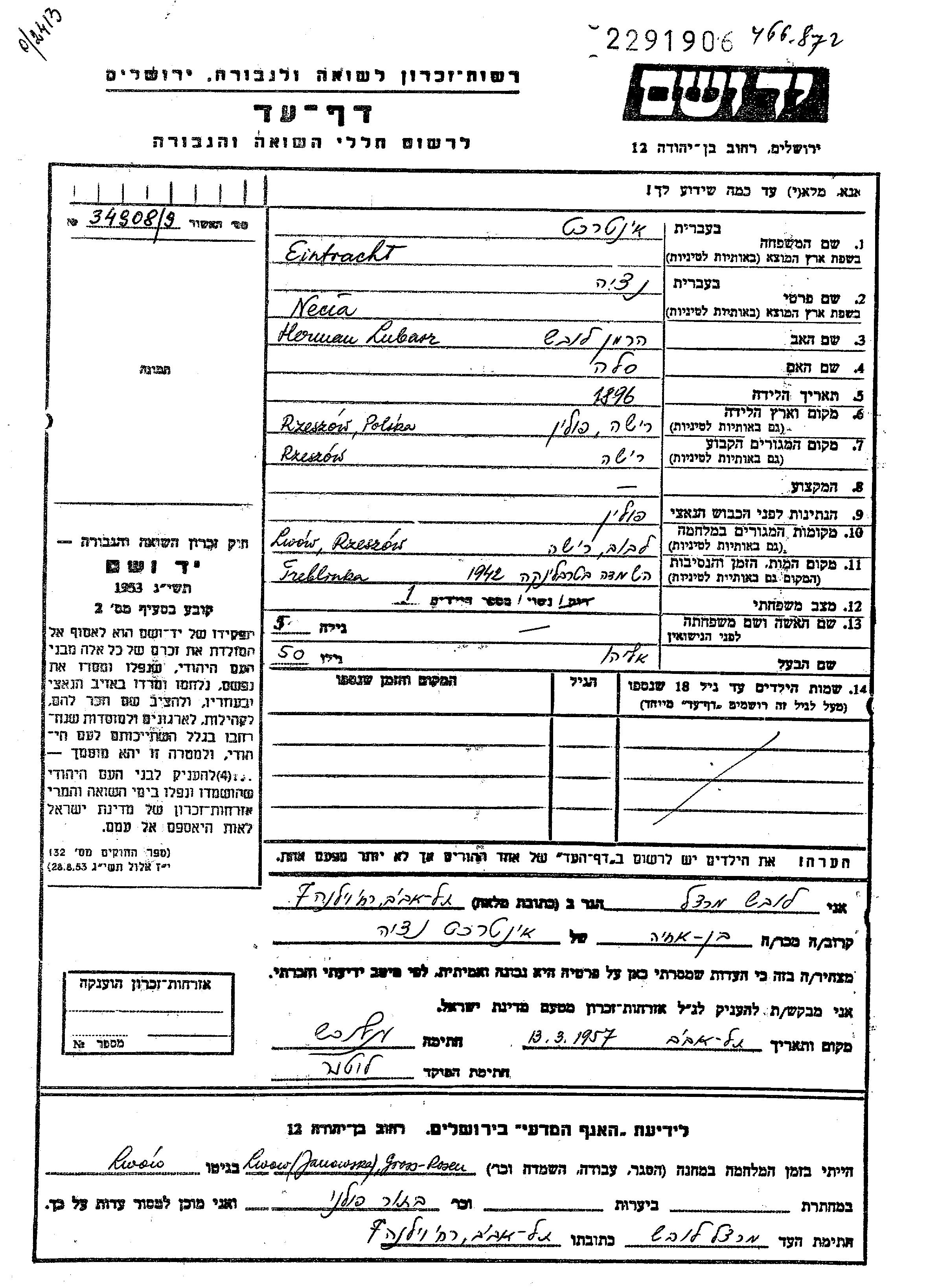 Necia Nesia Eintracht was born in Rzeszow, Poland, 1896 to Herman and Sala. She was married to Eliahu. Prior to WWII she lived in Rzeszow, Poland. During the war she was in Lwow, Poland.