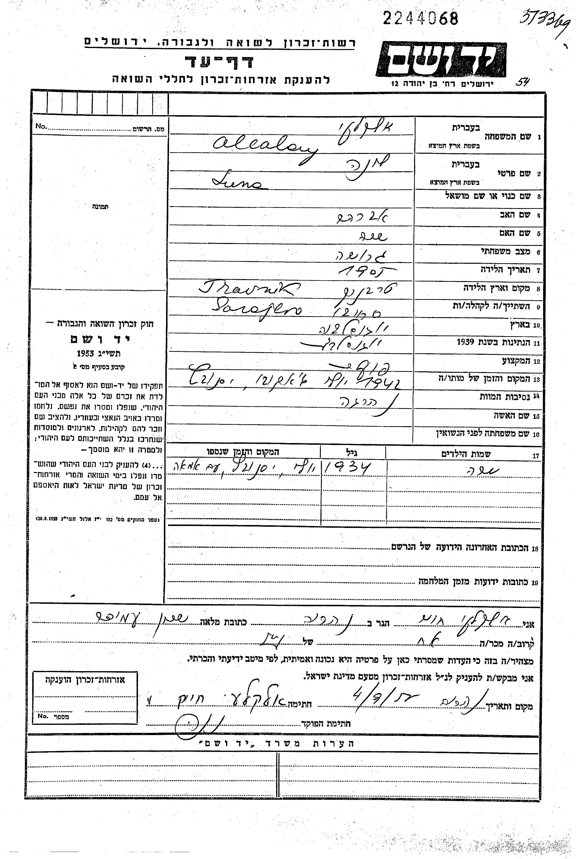 | Alcalay | Sheine Luna | 1905 | Sarajevo, Yugoslavia | Page of Testimony |