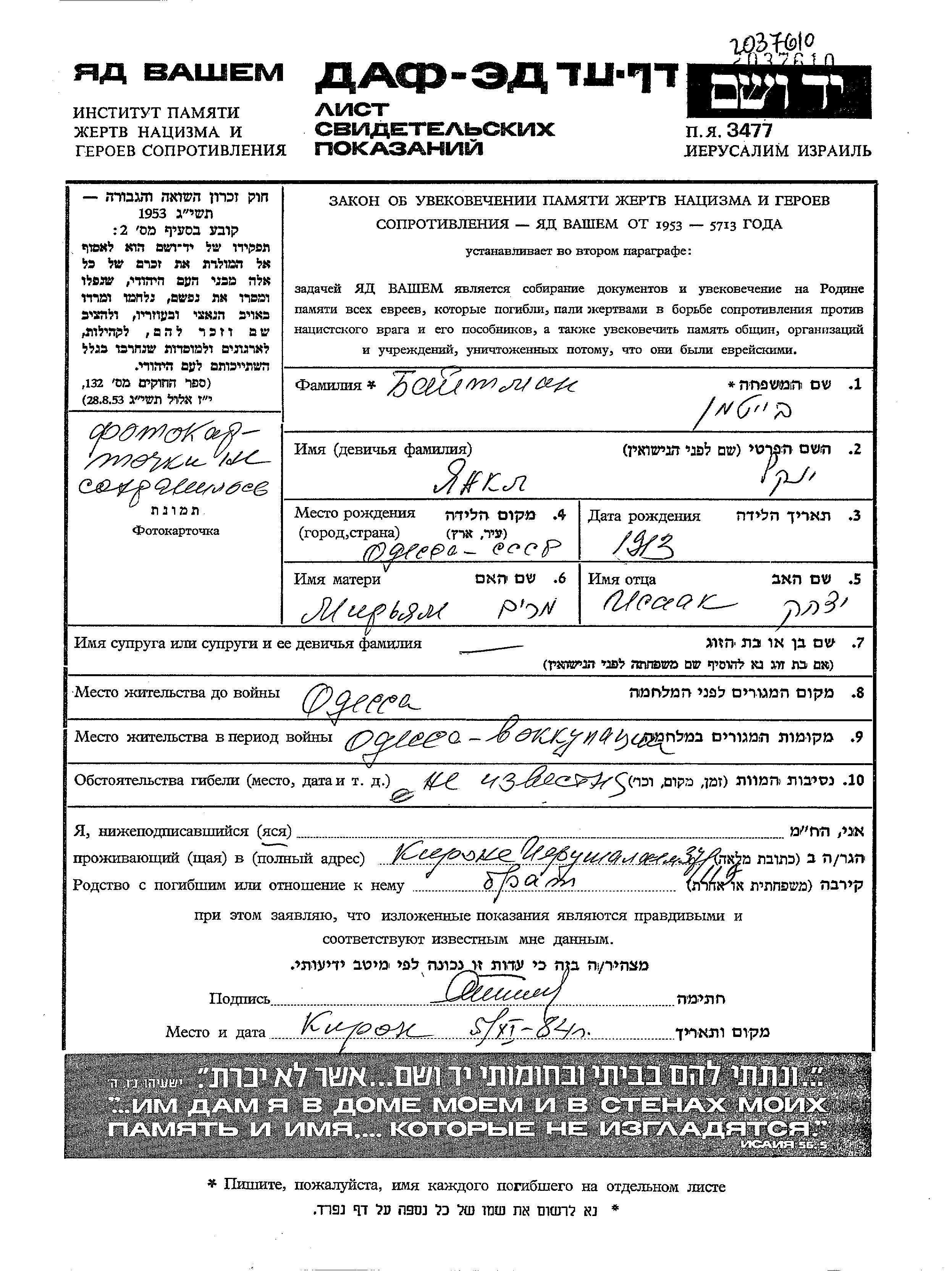 Baitman Yankel 1913 Odessa, Ukraine (USSR) Page of Testimony