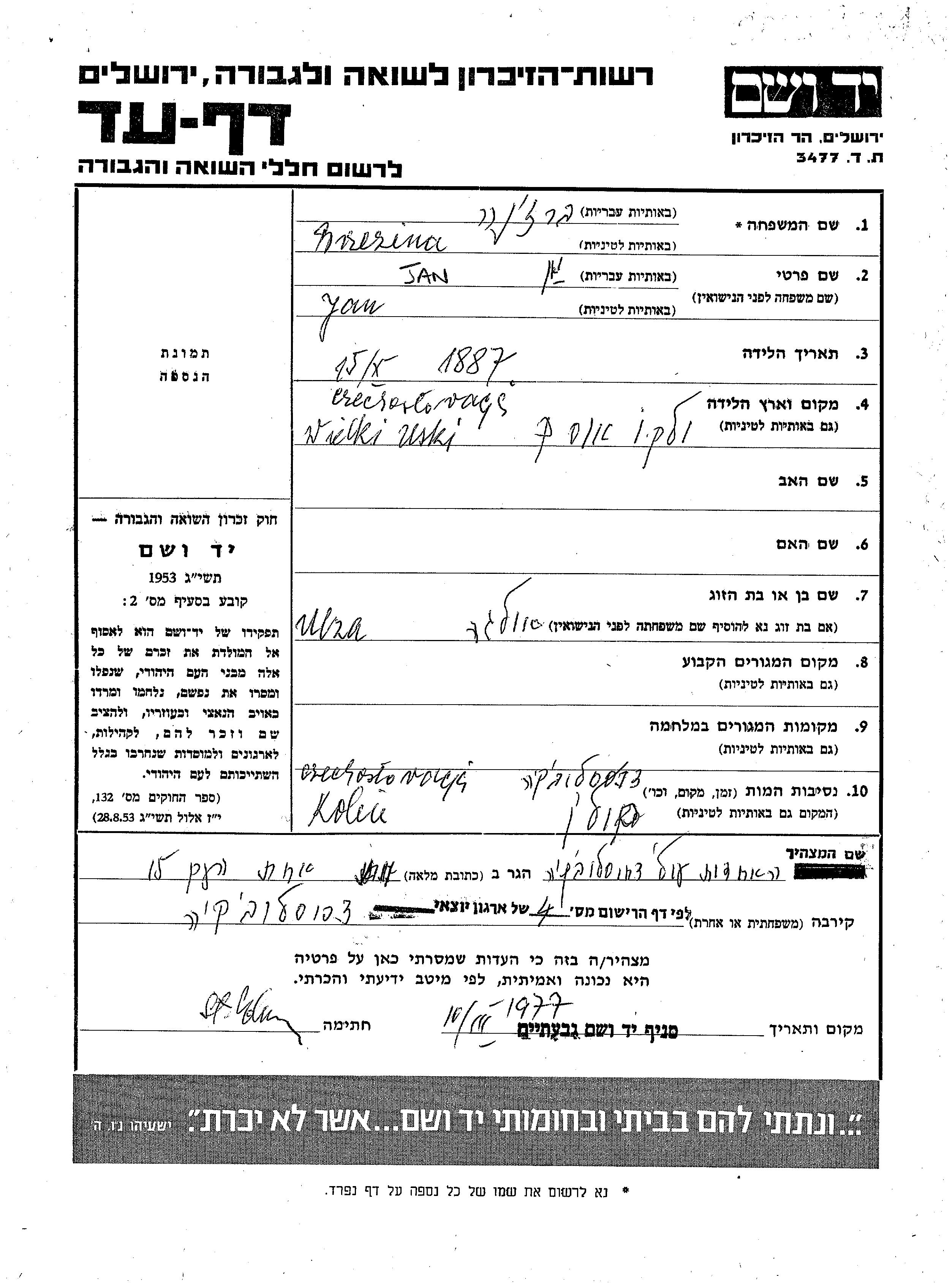 Yad Vashem - Pages of Testimony Names Memorial Collection