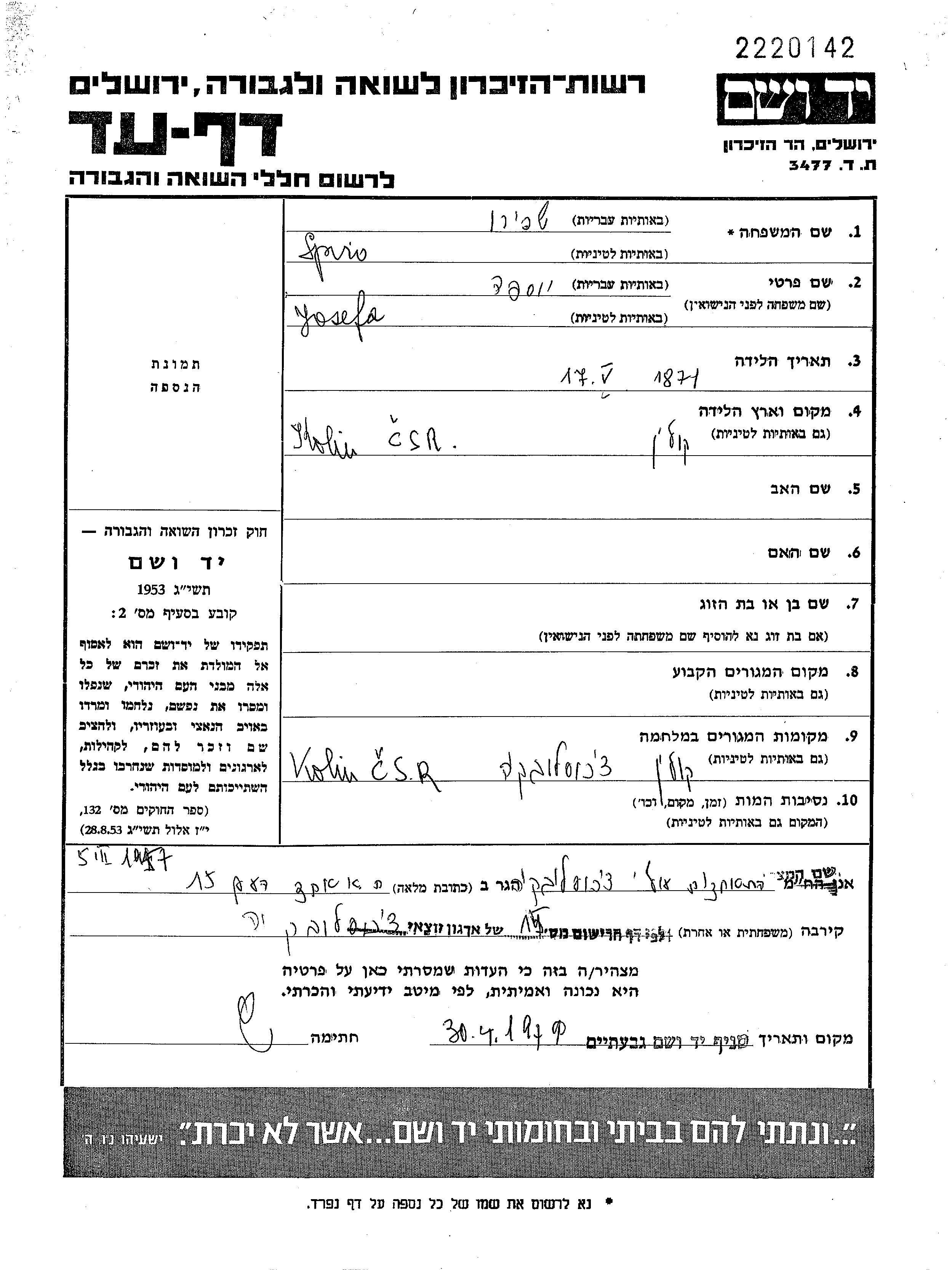 Shapira Josefa 1871 unstated place, Page of Testimony