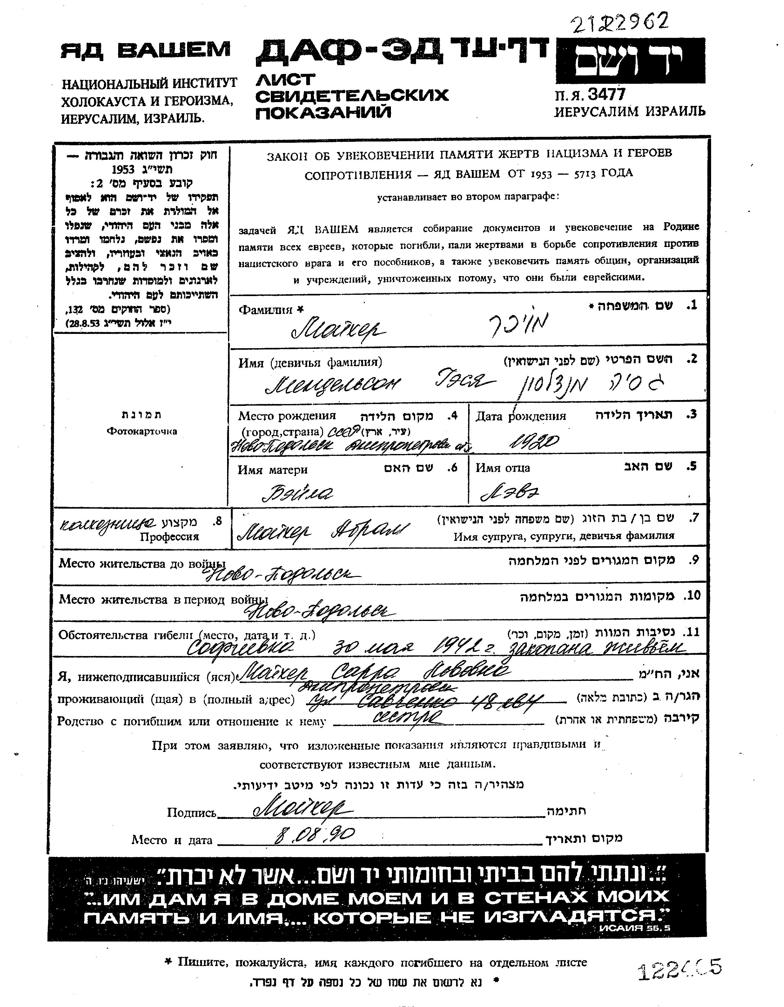 Gesia Moikher nee Mendelson was born in Novopodolsk, Ukraine (USSR), 1920 to Liova and Beila. She was an agriculturist and married to Abram. Prior to WWII she lived in Novopodolsk, Ukraine (USSR). During the war she was in Novopodolsk, Ukraine (USSR). Gesia was murdered in the Shoah. Place of death: Sofiyevka, Ukraine (USSR), 30/05/1942.