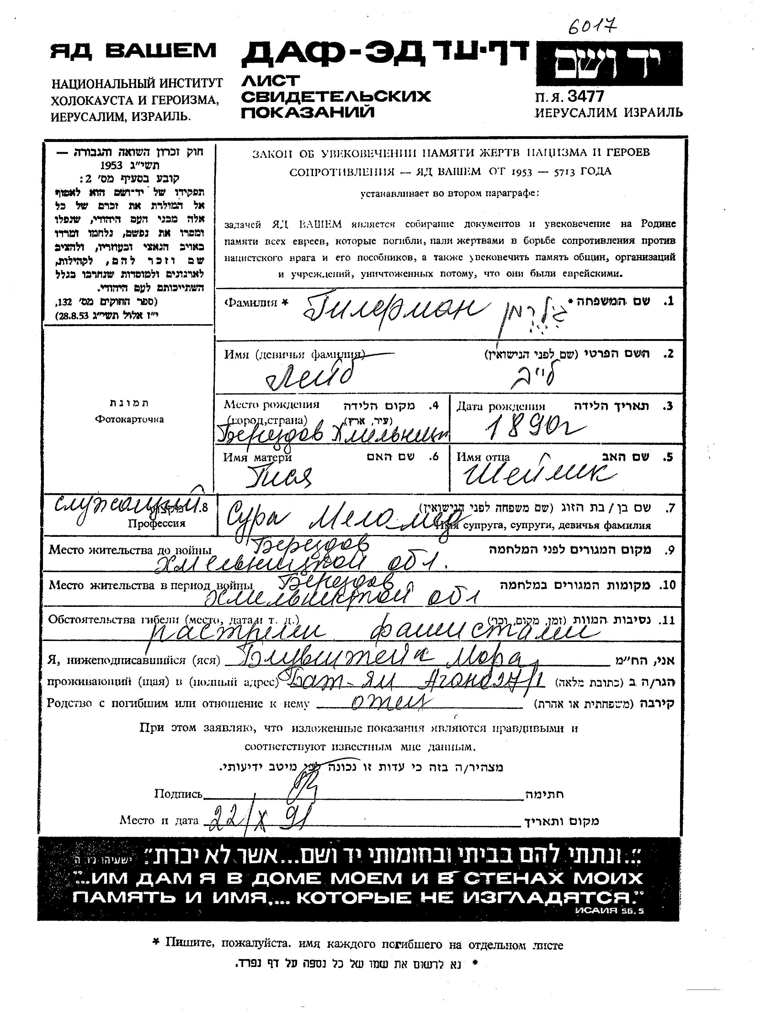 Gilerman Leib 1890 Berezdov, Ukraine (USSR) Page of Testimony