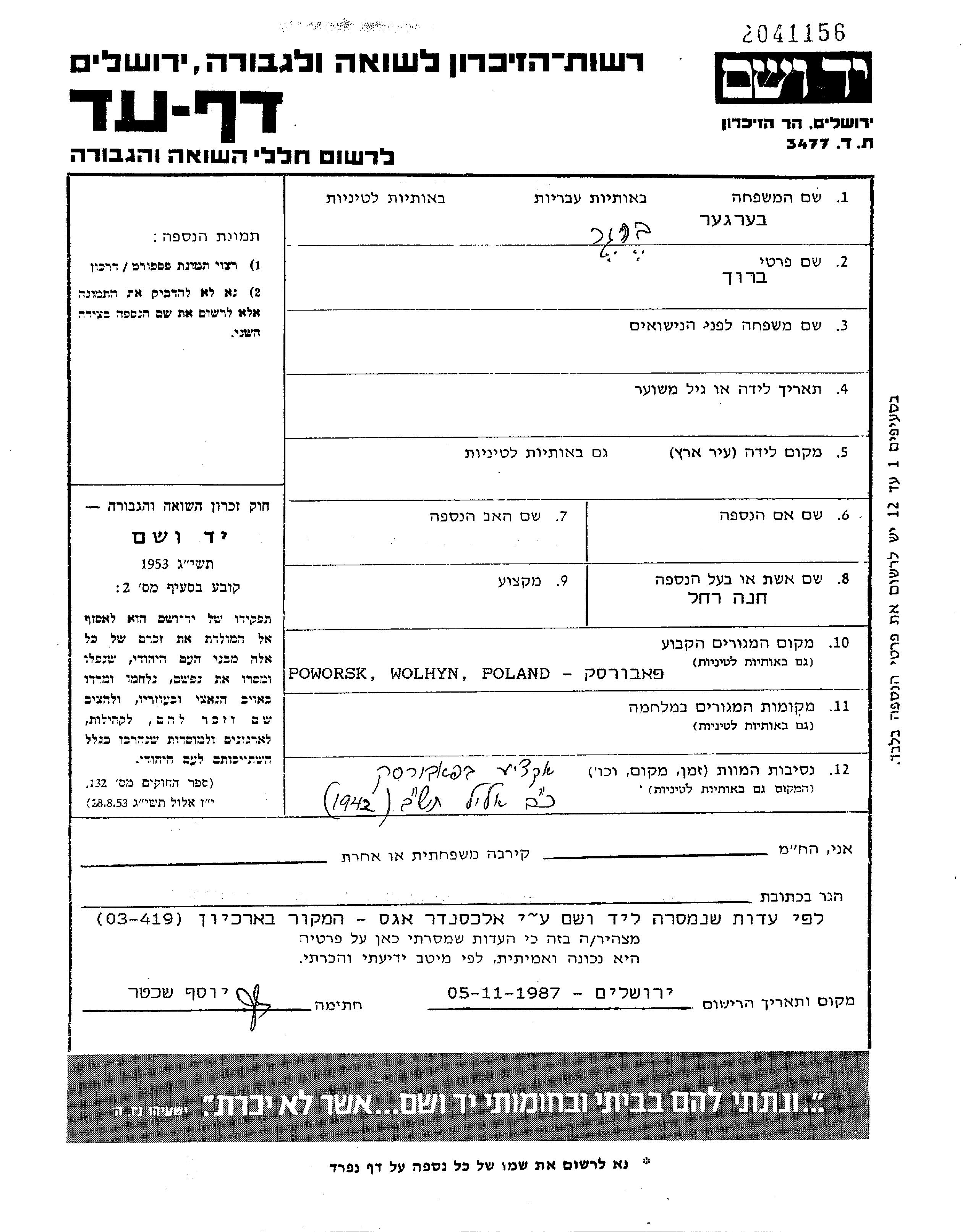 Barukh Berger. He was married to Khana Rakhel. Prior to WWII he lived in Poworsk, Poland. During the war he was in Poworsk, Poland. Barukh was murdered in the Shoah. Place of death: Poworsk, Poland, 04/09/1942.