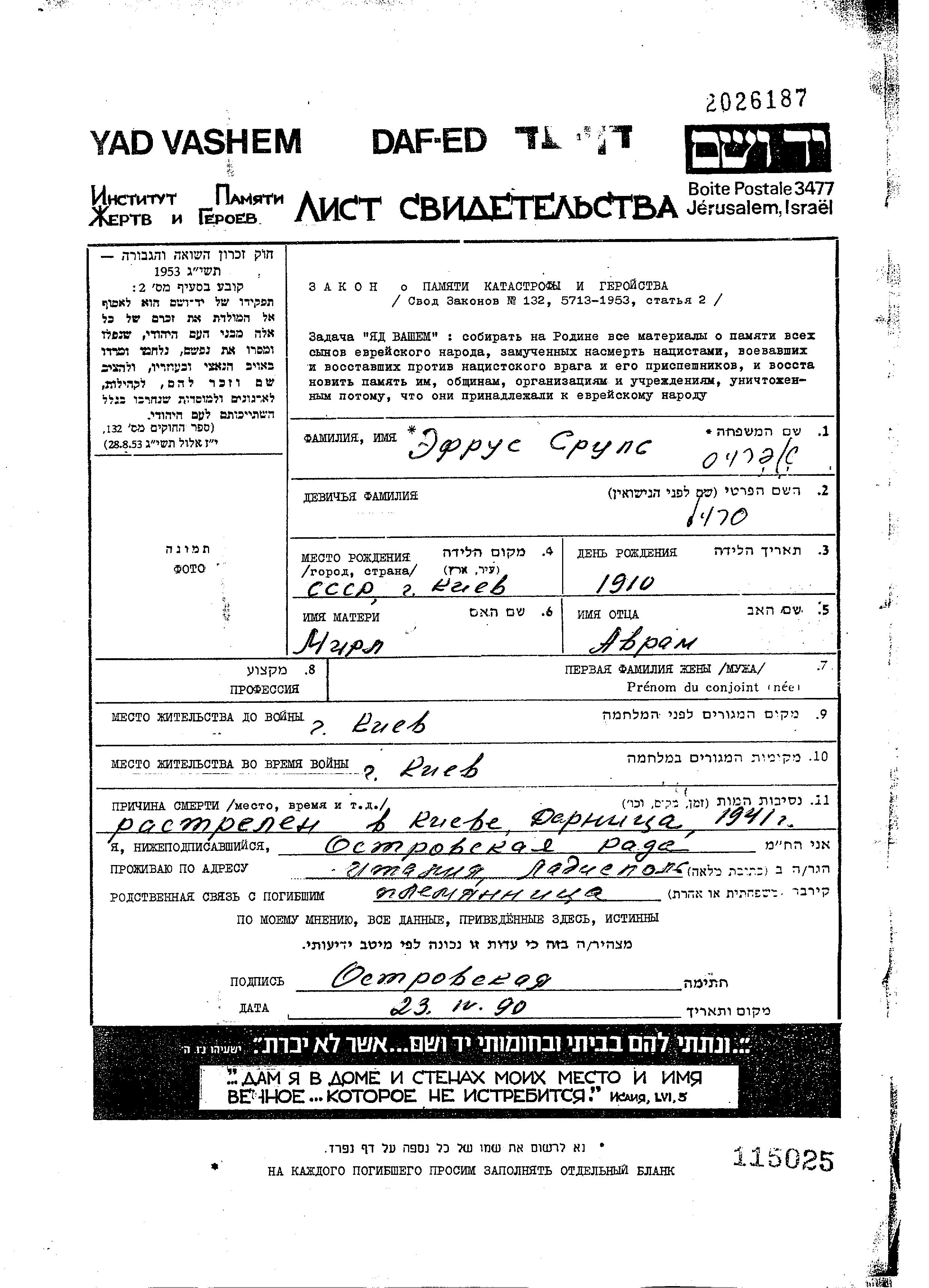 Efros Srul 1910 Kiyev, Ukraine (USSR) Page of Testimony