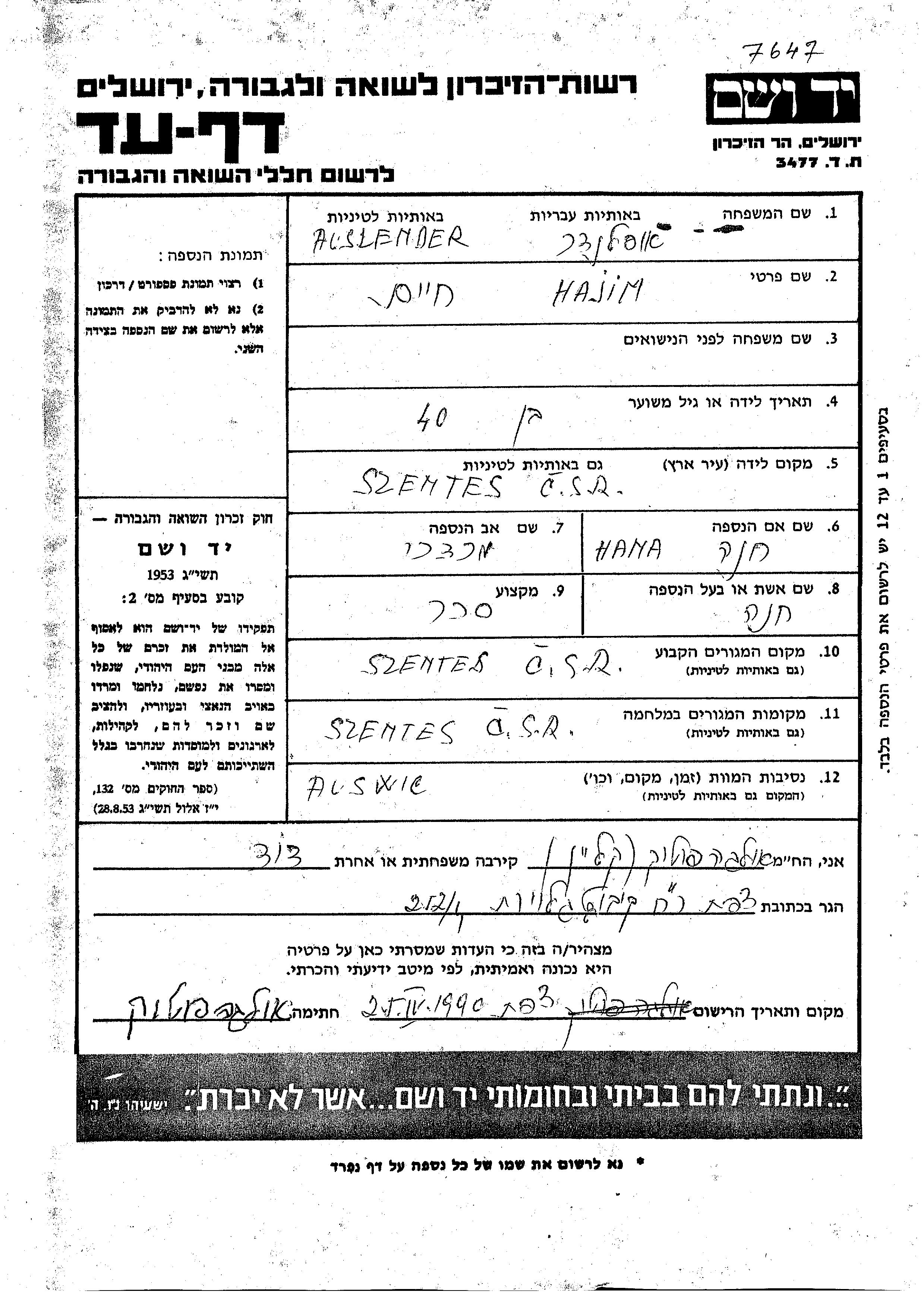 Auslender Hajim Szentes, Czechoslovakia Page of Testimony