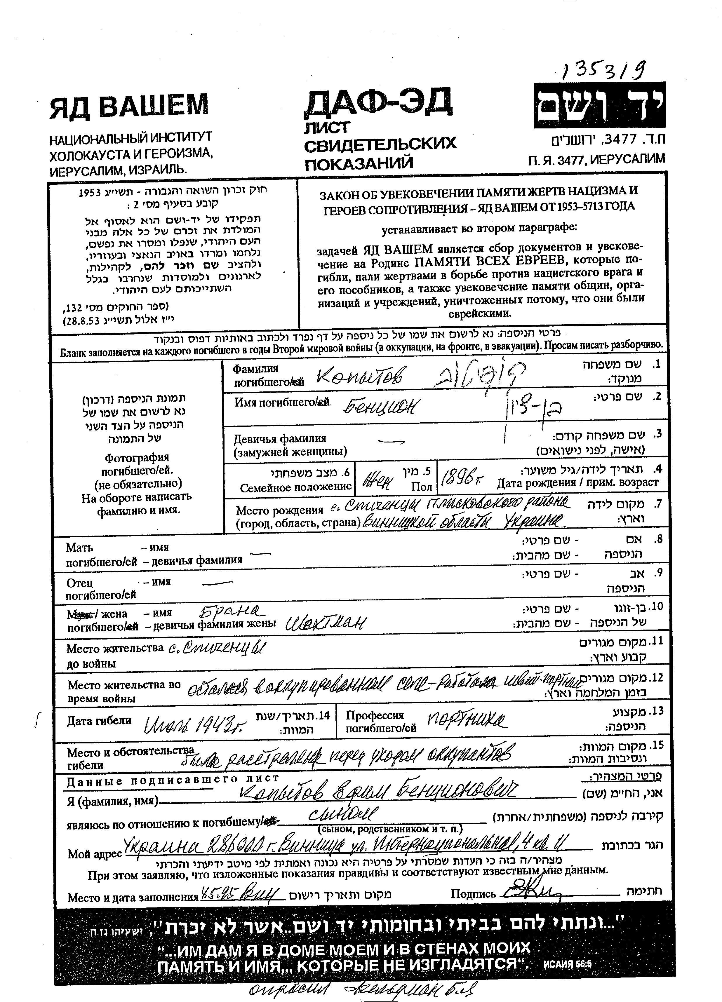Bentzion Kopytov was born in Spichintsy, Ukraine (USSR), 1896. He was a seamstress and married to Brana. Prior to WWII he lived in Spichintsy, Ukraine (USSR). During the war he was in Spichintsy, Ukraine (USSR). Bentzion was murdered in the Shoah. Place of death: unknown, 1943.