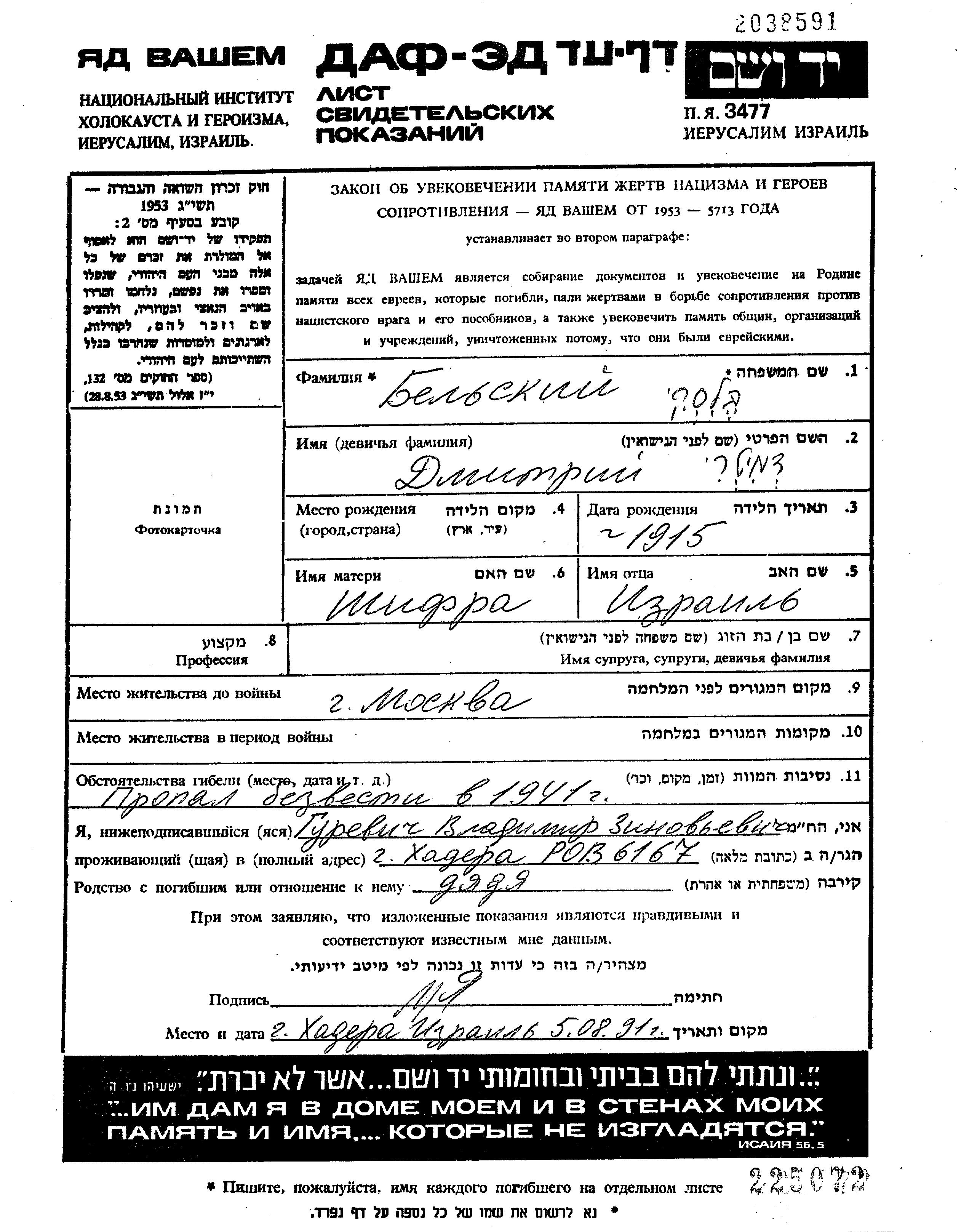 Belski Dmitri Moskva, Russia (USSR) Page of Testimony