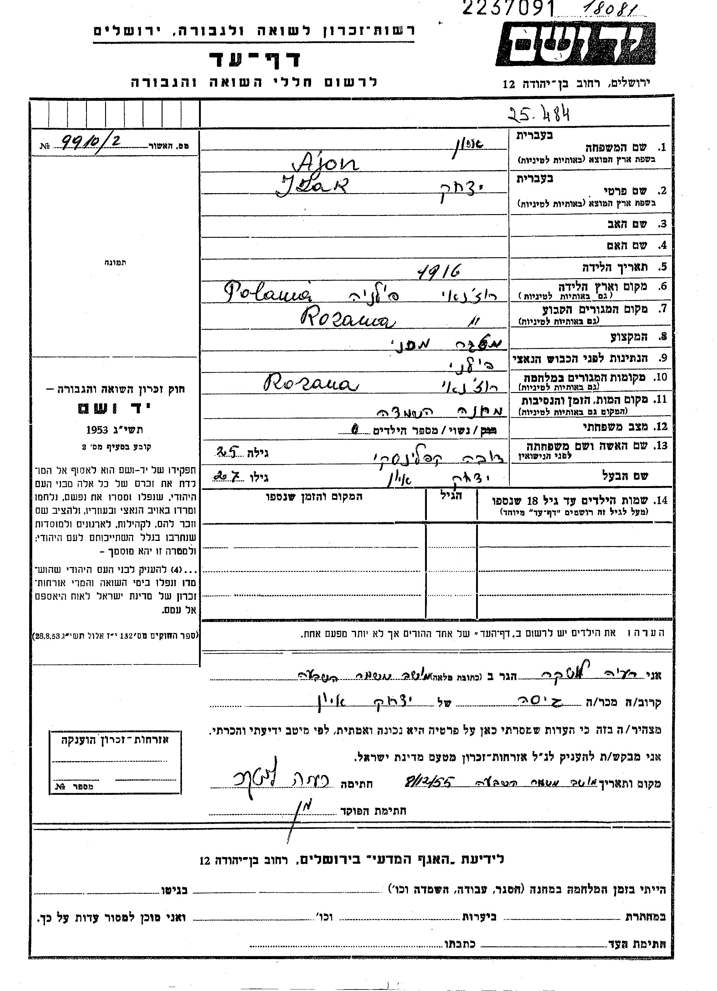 Izak Ajon was born in Rozana, Poland, 1916. He was a mechanic and married to Doba. Prior to WWII he lived in Rozana, Poland. During the war he was in Rozana, Poland. Izak was murdered in the Shoah.