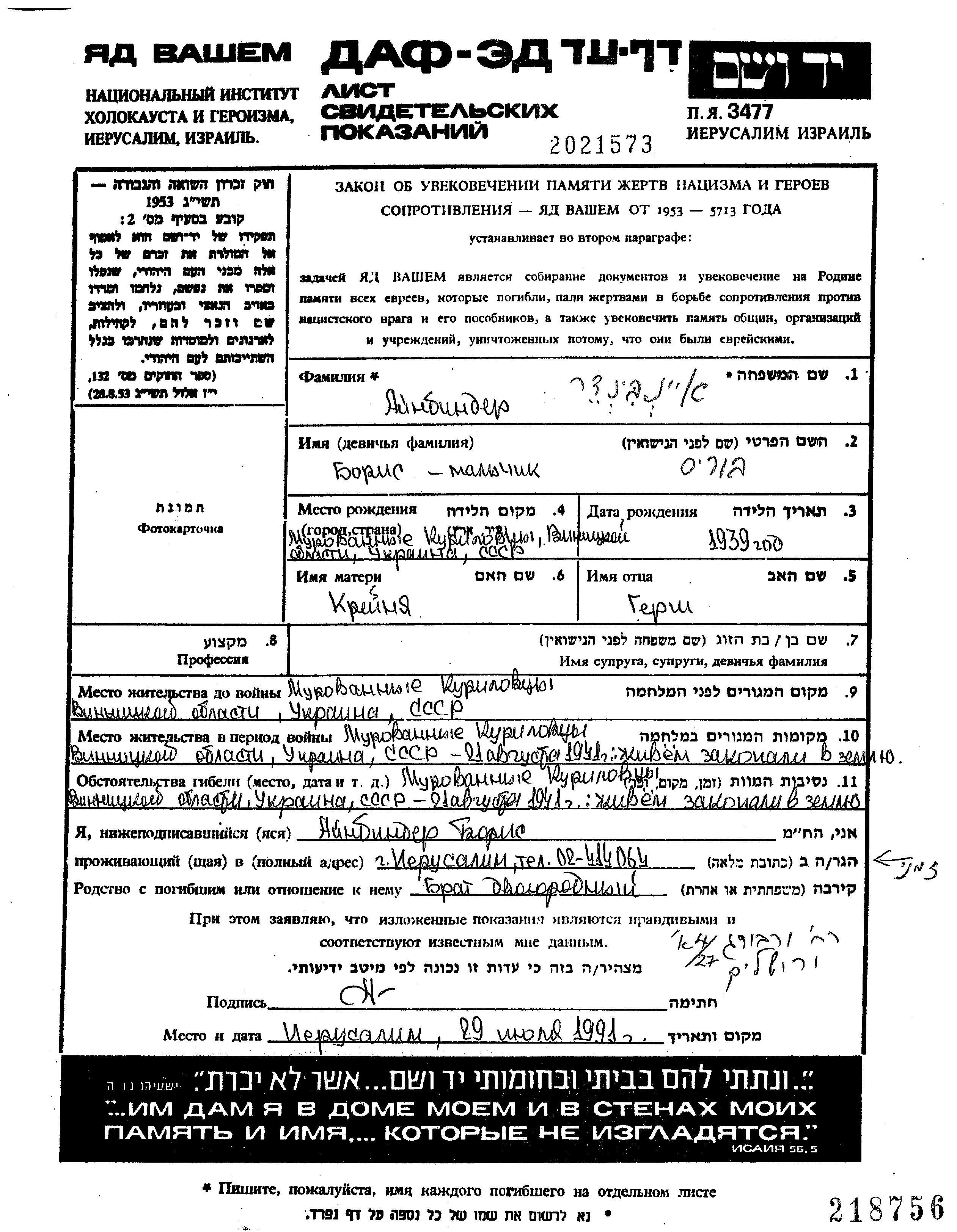 Boris Ainbinder was born in Murovanyye Kurilovtsy, Ukraine (USSR), 1939 to Gersh and Kreynya. He was child. Prior to WWII he lived in Murovanyye Kurilovtsy, Ukraine (USSR). During the war he was in Murovanyye Kurilovtsy, Ukraine (USSR). Boris was murdered in the Shoah. Place of death: Murovanyye Kurilovtsy, Ukraine (USSR), 21/08/1941.