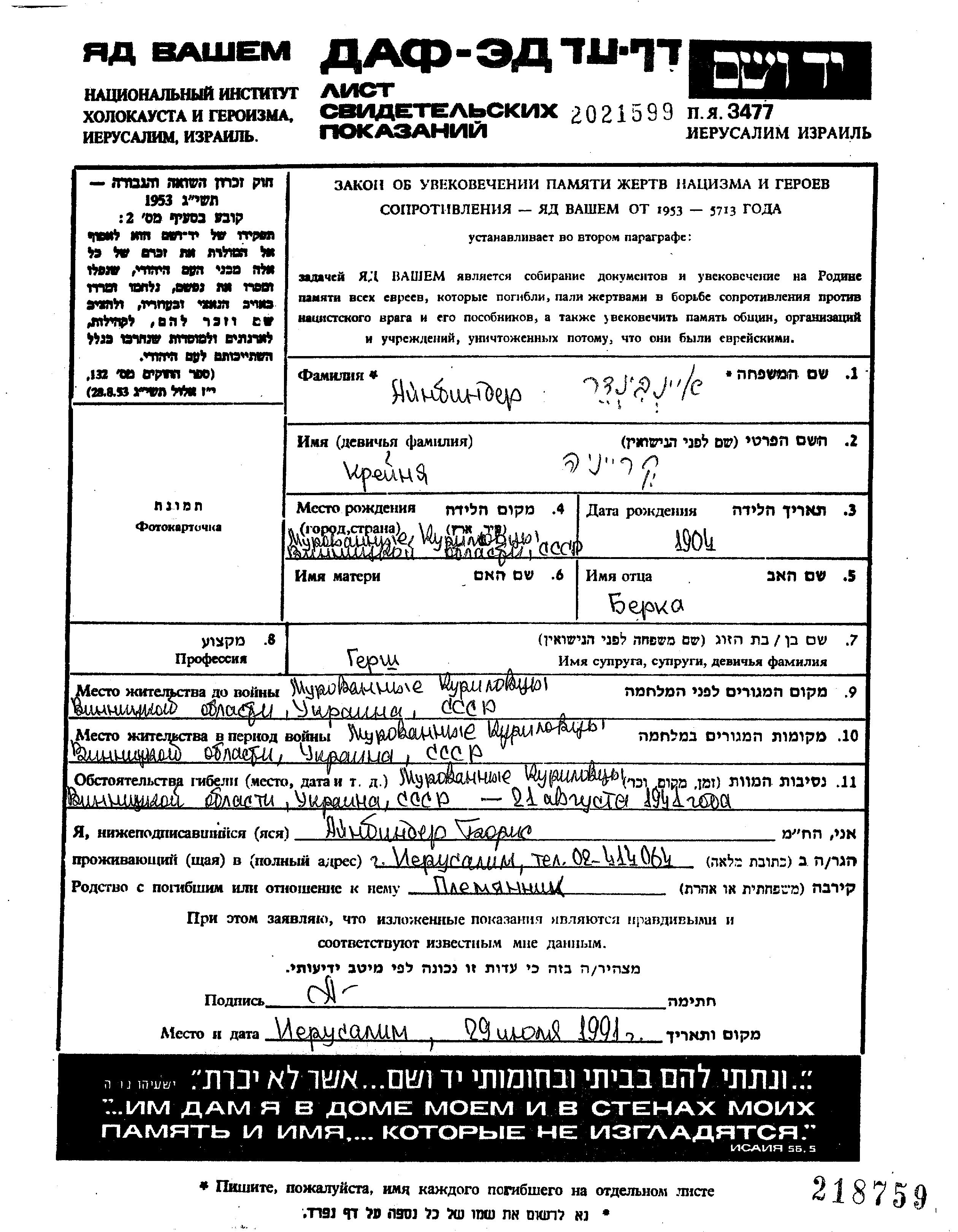 Kreynya Ainbinder was born in Murovanyye Kurilovtsy, Ukraine (USSR), 1904 to Berka. She was married to Gersh. Prior to WWII she lived in Murovanyye Kurilovtsy, Ukraine (USSR). During the war she was in Murovanyye Kurilovtsy, Ukraine (USSR). Kreynya was murdered in the Shoah. Place of death: Murovanyye Kurilovtsy, Ukraine (USSR), 21/08/1941.
