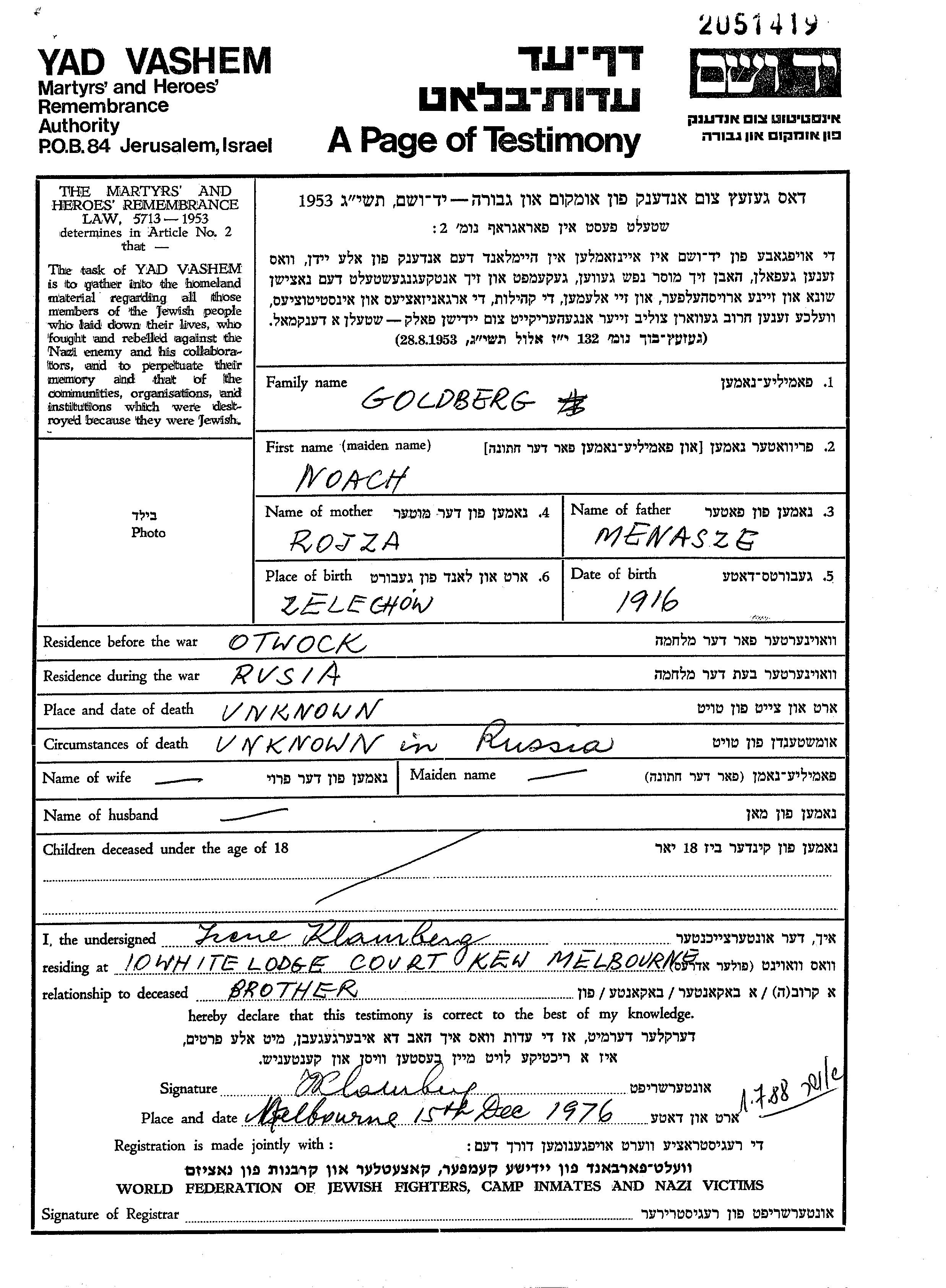 Goldberg Noach 1916 Otwock, Poland Page of Testimony