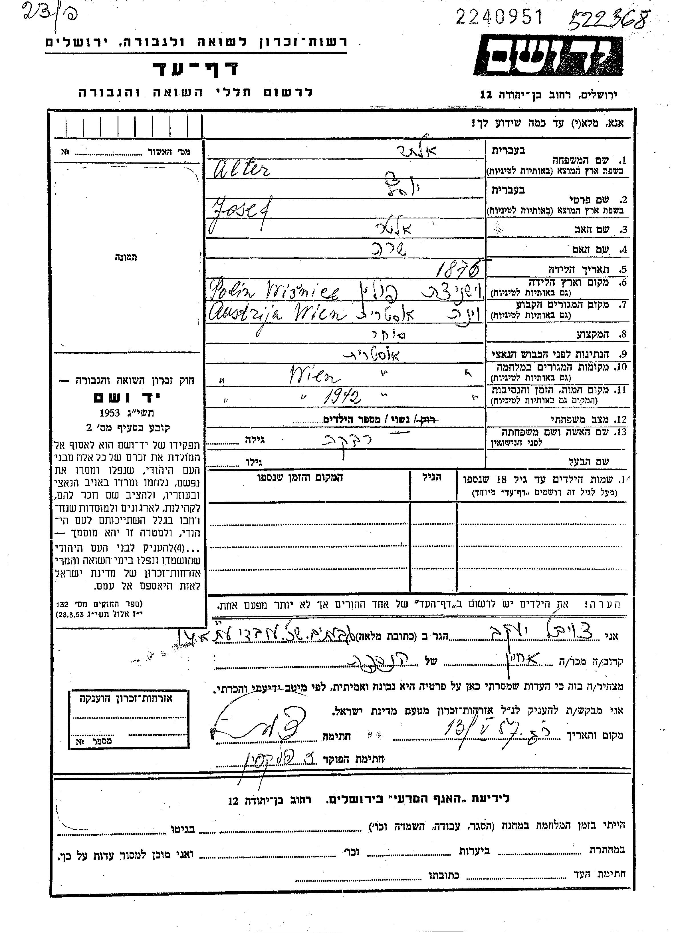 Alter Josef 1875 Wien, Austria Page of Testimony