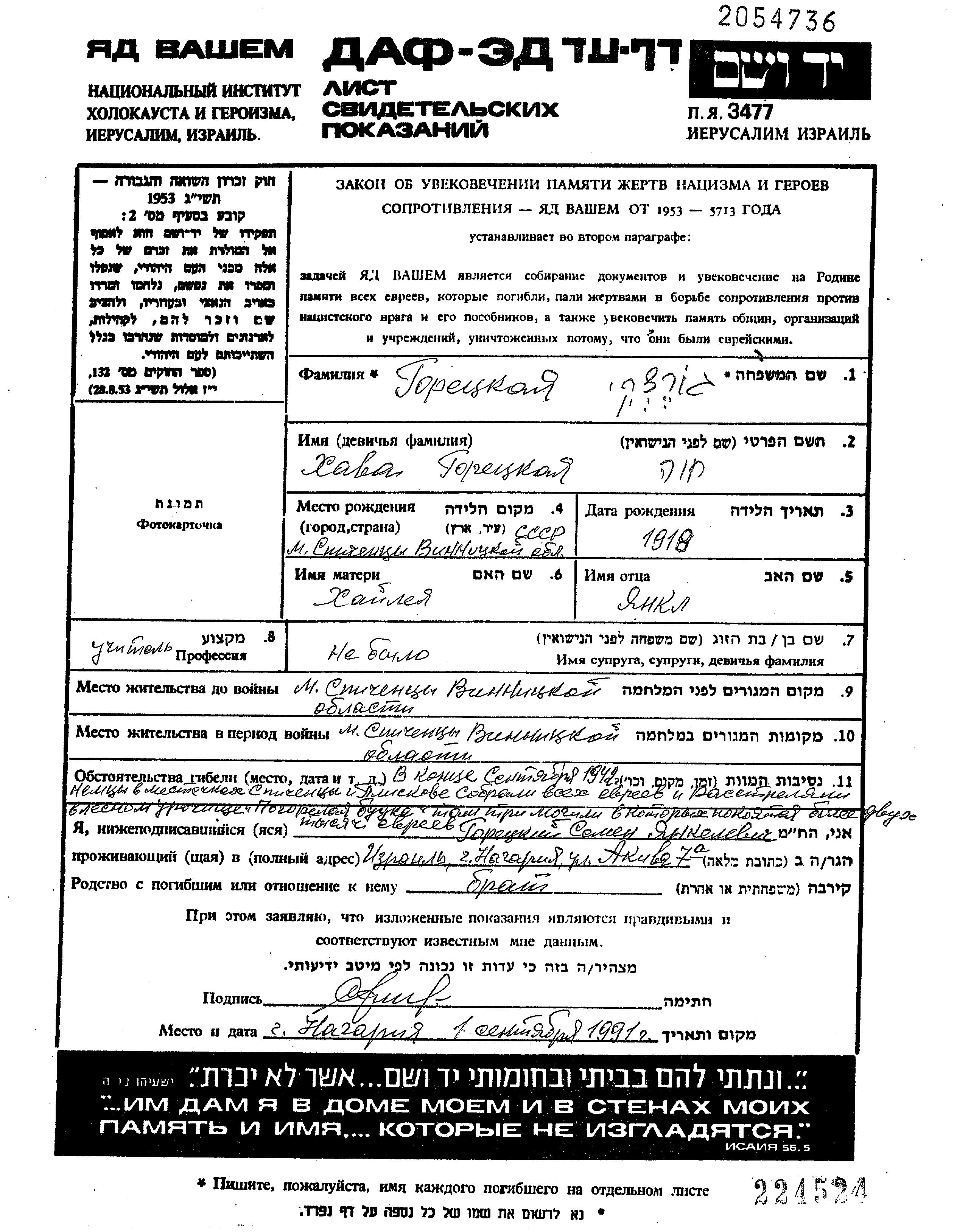 Khava Goretzki was born in Spichintsy, Ukraine (USSR) to Yankl and Khaia Leya nee Vinitzki. She was a teacher and single. Prior to WWII she lived in Spichintsy, Ukraine (USSR). During the war she was in Spichintsy, Ukraine (USSR). Khava was murdered in the Shoah. Place of death: Vinnitsa, Ukraine (USSR).