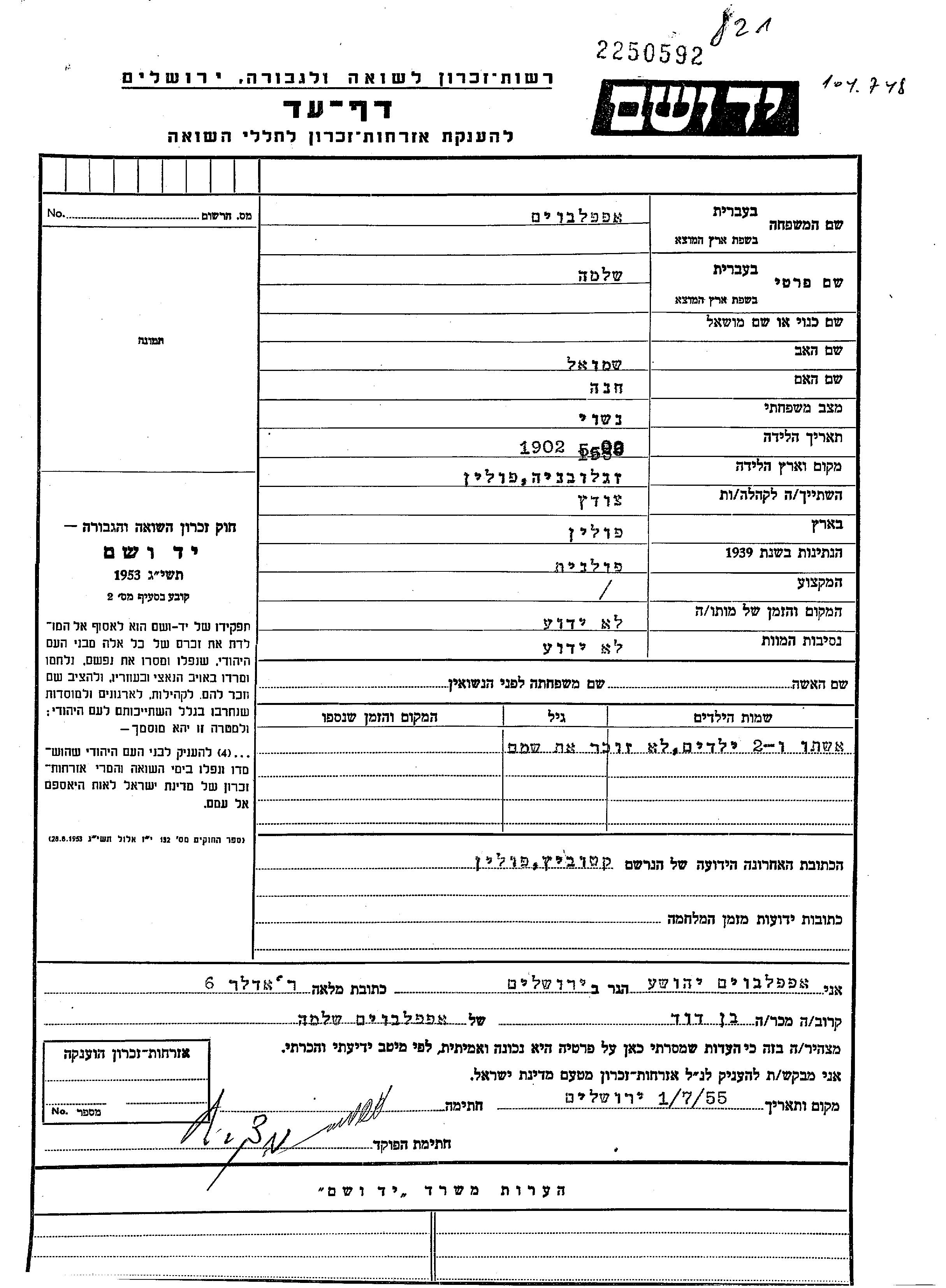 Shlomo Appelboim was born in Zglobien, Poland, 1902 to Shmuel and Khana. He was married. Prior to WWII he lived in Kattowitz, Poland. During the war he was in Poland. Shlomo was murdered in the Shoah.