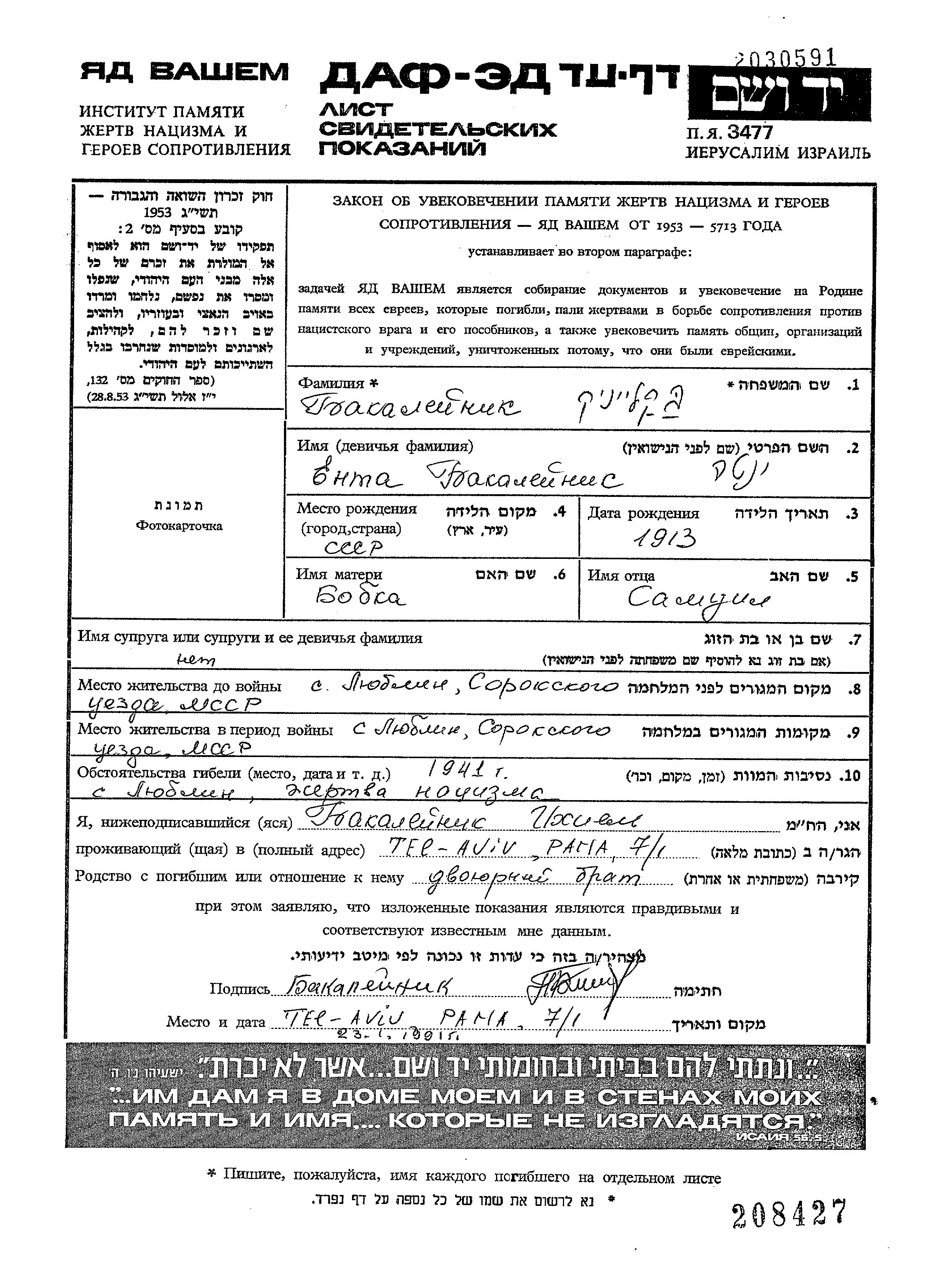 Enta Bakaleinik was born, 1913 to Samuil and Bobka. She was single. Prior to WWII she lived in Liublin, Romania. During the war she was in Liublin, Romania. Enta was murdered in the Shoah. Place of death: Liublin, Romania, 1941.