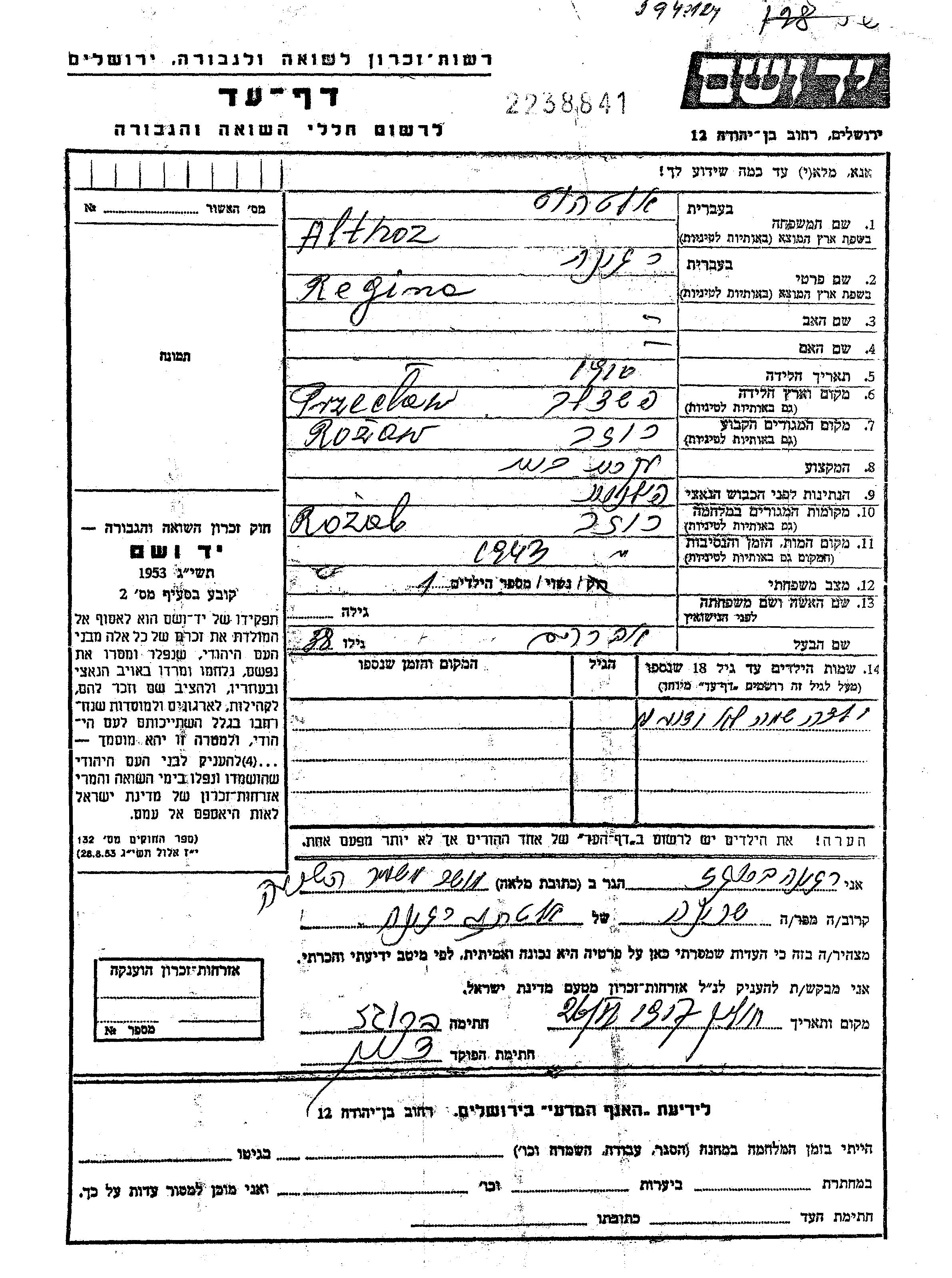 Regina Althoz was born in Przeclaw, Poland, 1910. She was a housewife and married to Avraham. Prior to WWII she lived in Kozow, Poland. During the war she was in Kozow, Poland. Regina was murdered in the Shoah. Place of death: Kozow, Poland, 1943.