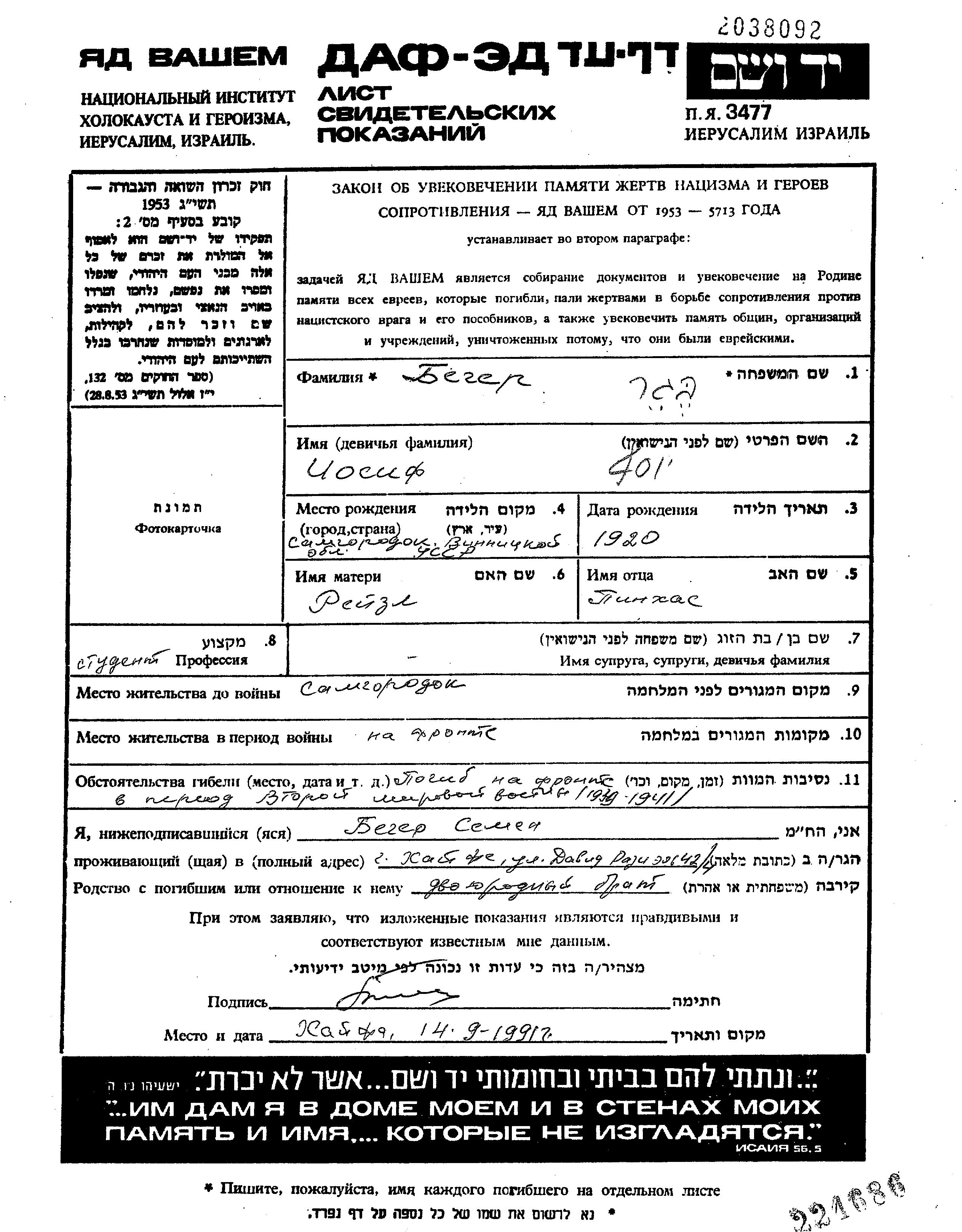 Iosif Beger was born in Samgorodok, Ukraine (USSR), 1920 to Pinkhas and Reizl. He was a student and single. Prior to WWII he lived in Samgorodok, Ukraine (USSR). During the war he was in the Soviet armed forces. Iosif was killed in military service in WWII.