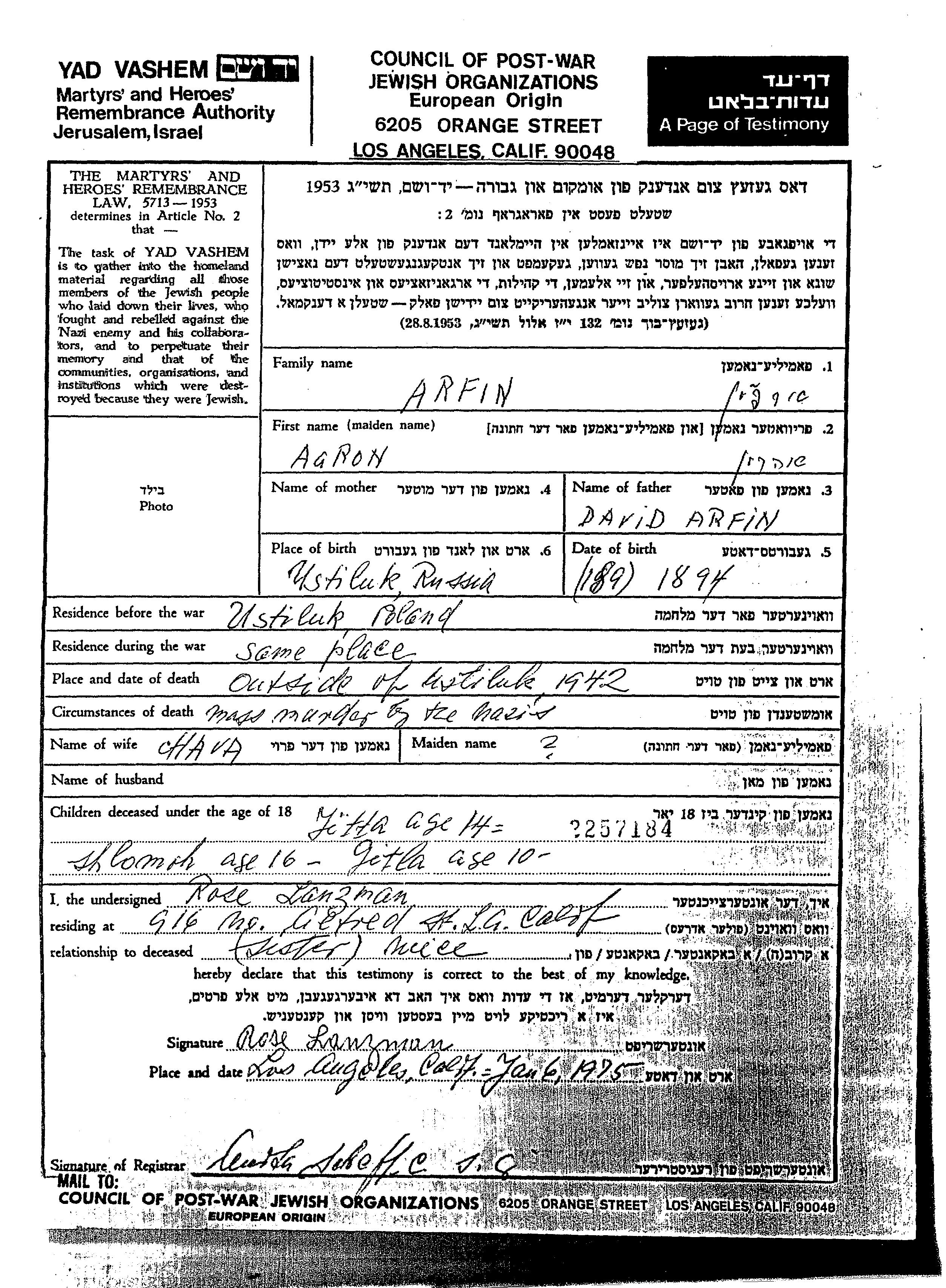 Itta Arfin was born in Ust Labinsk, Russia (USSR), 1928 to Aaron and Chava. She was single. Prior to WWII she lived in Ust Labinsk, Russia (USSR). During the war she was in Ust Labinsk, Russia (USSR). Itta was murdered in the Shoah. Place of death: Ust Labinsk, Russia (USSR), 1942.