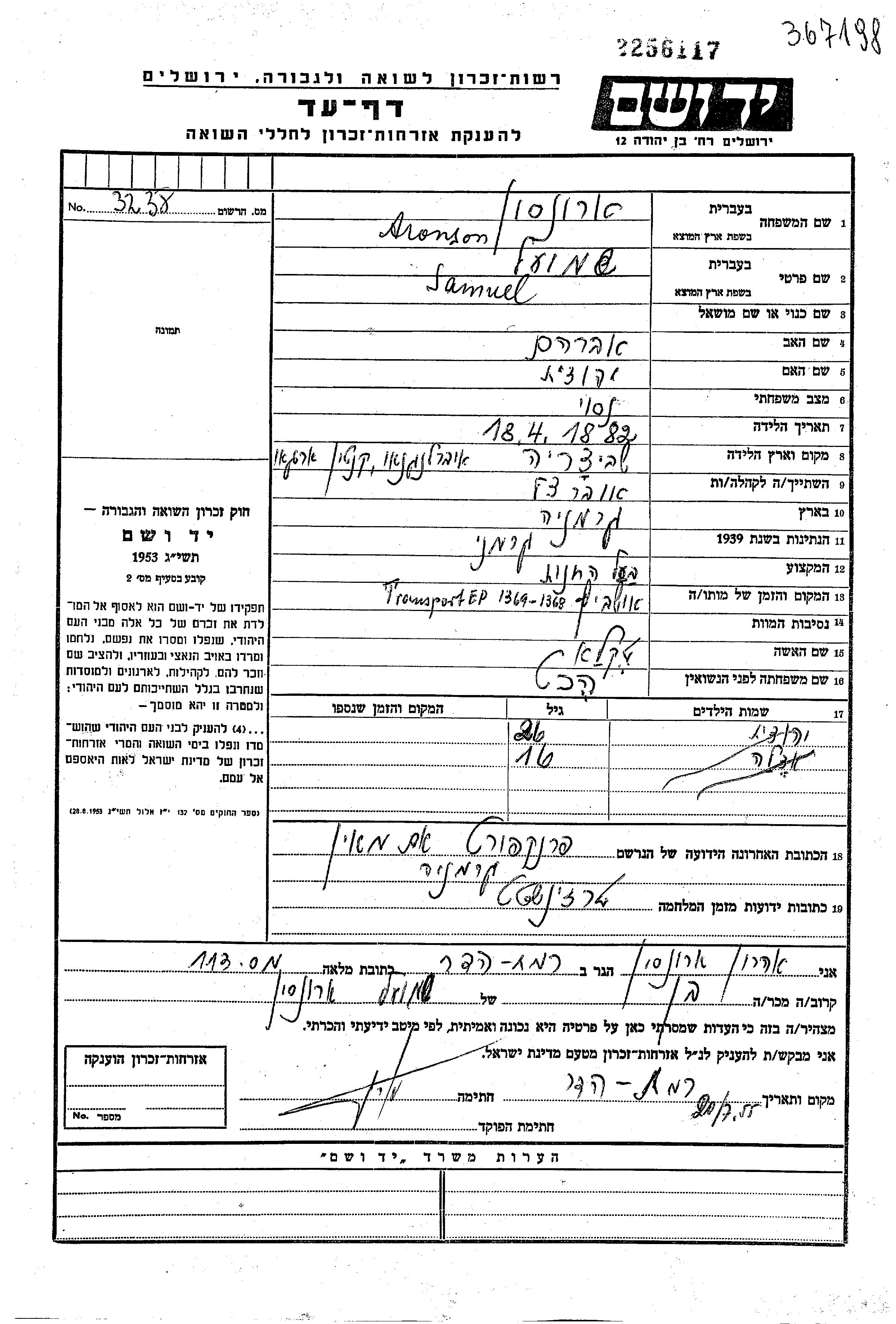 Aronson Shmuel 1882 Frankfurt Main, Germany Page of Testimony
