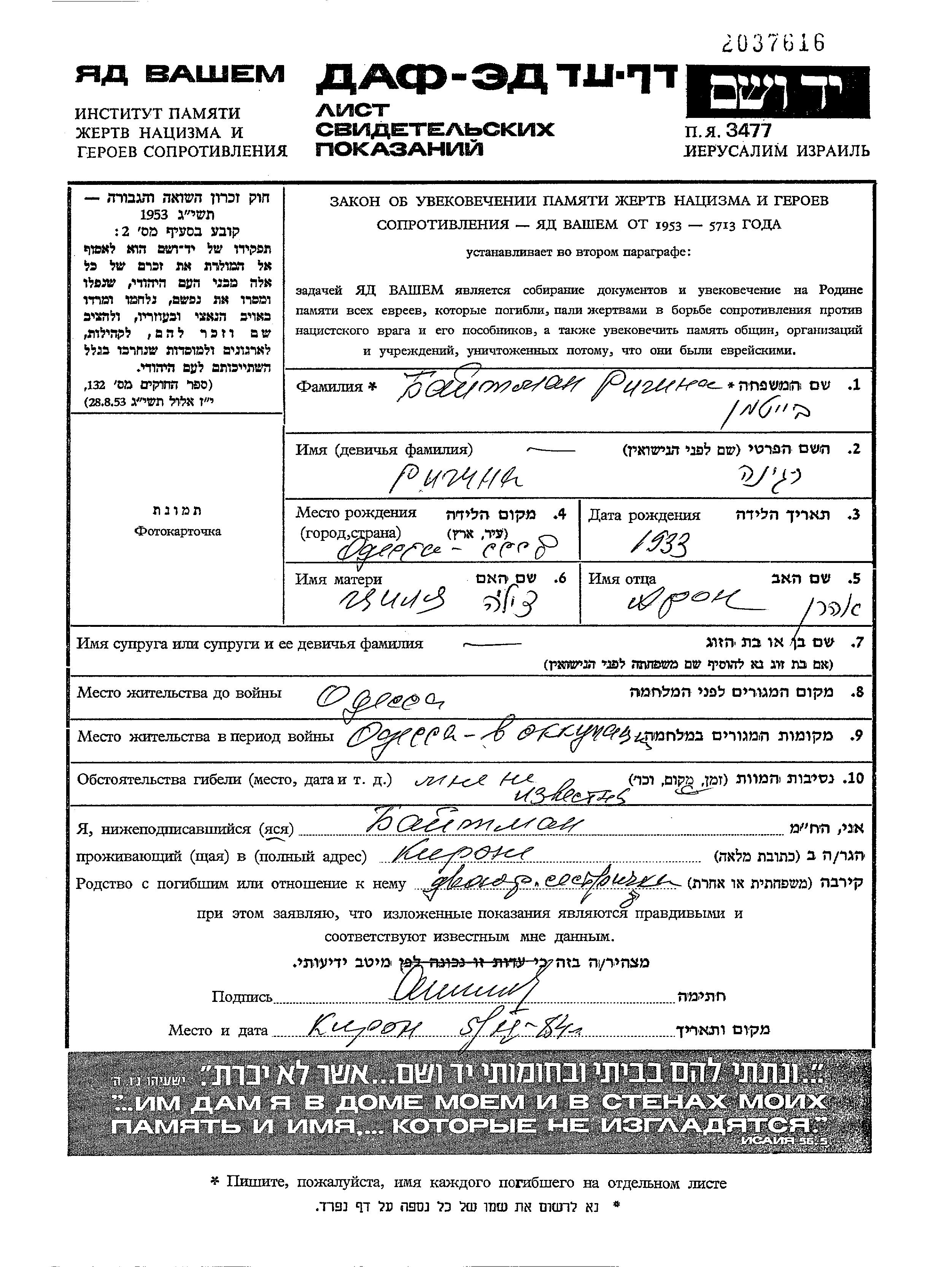 Baitman Regina 1933 Odessa, Ukraine (USSR) Page of Testimony