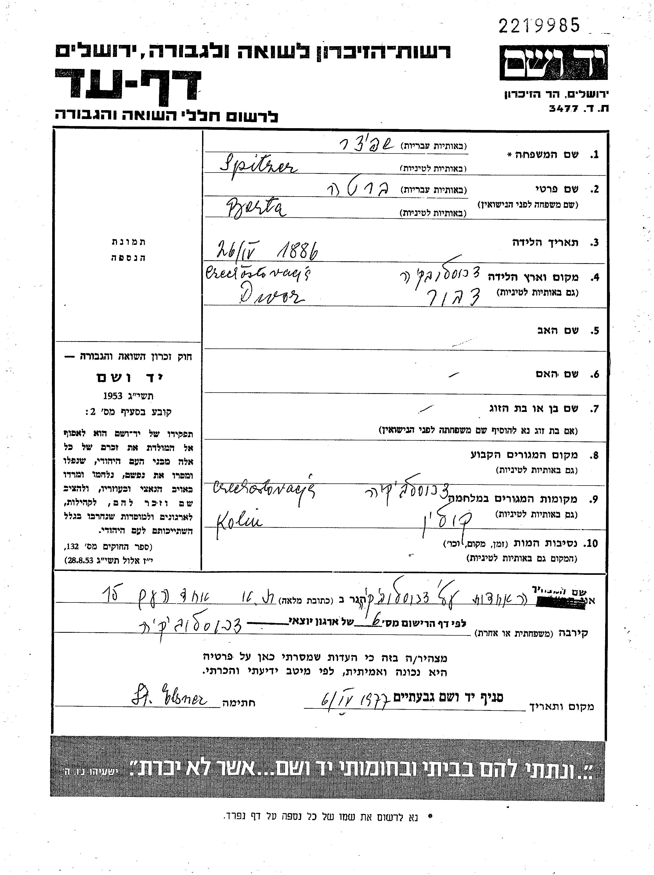 Spitzer Berta 1886 unstated place, Page of Testimony