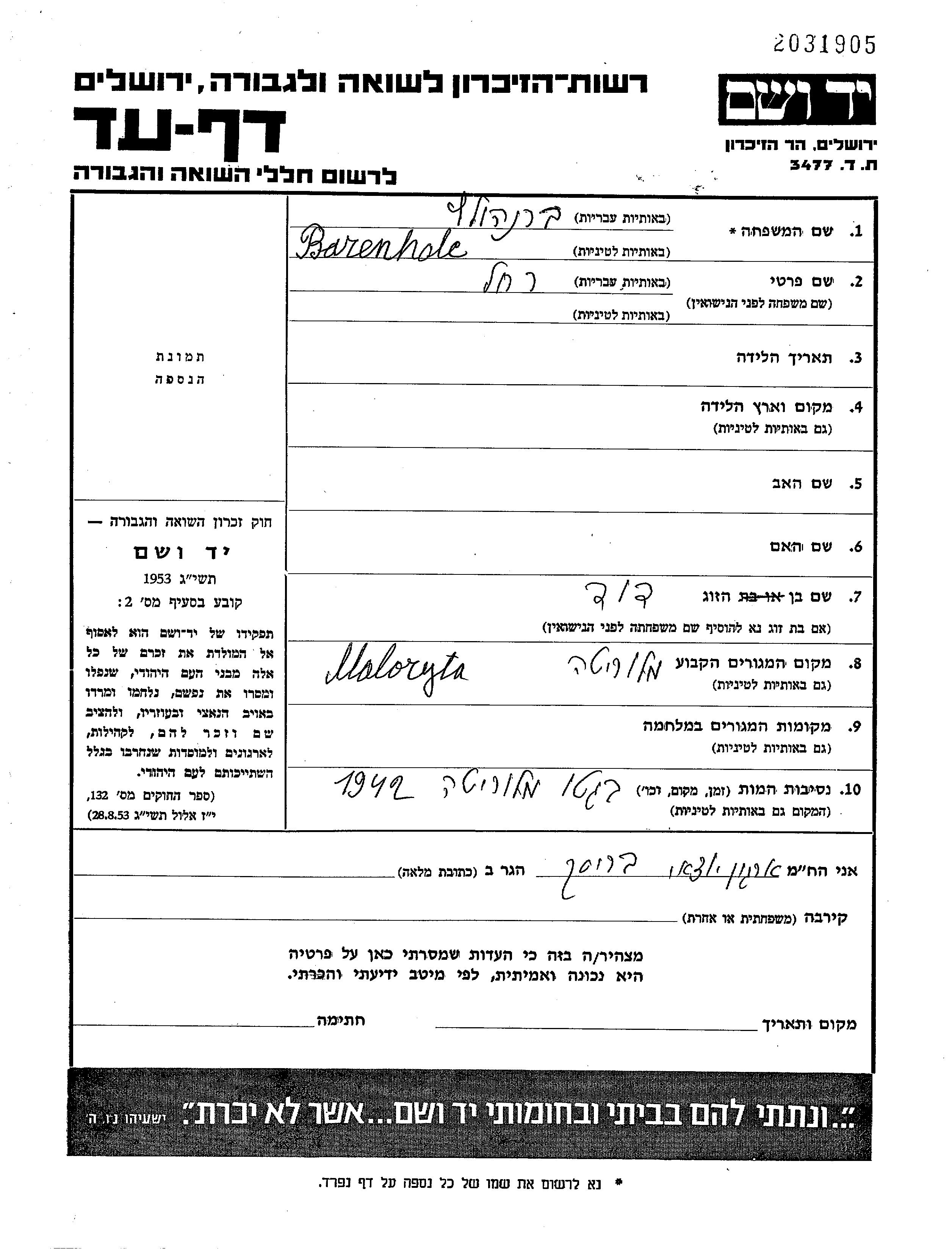 Rachel Barenholc. She was married to David. Prior to WWII she lived in Maloryta, Poland. During the war she was in Maloryta, Poland. Rachel was murdered in the Shoah. Place of death: Maloryta, Poland, 1942.