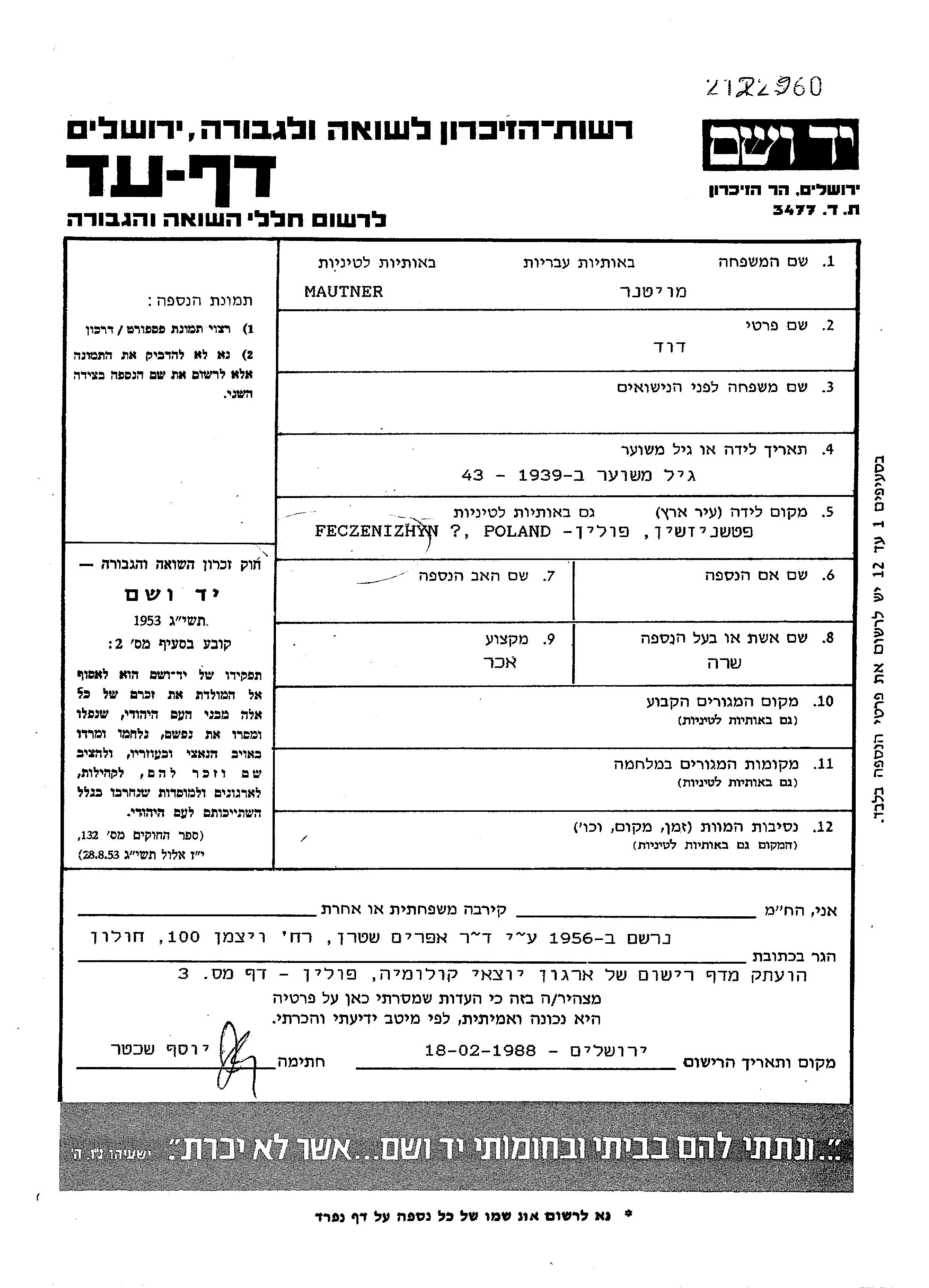 Mautner David 1896 Kolomyja, Poland Page of Testimony