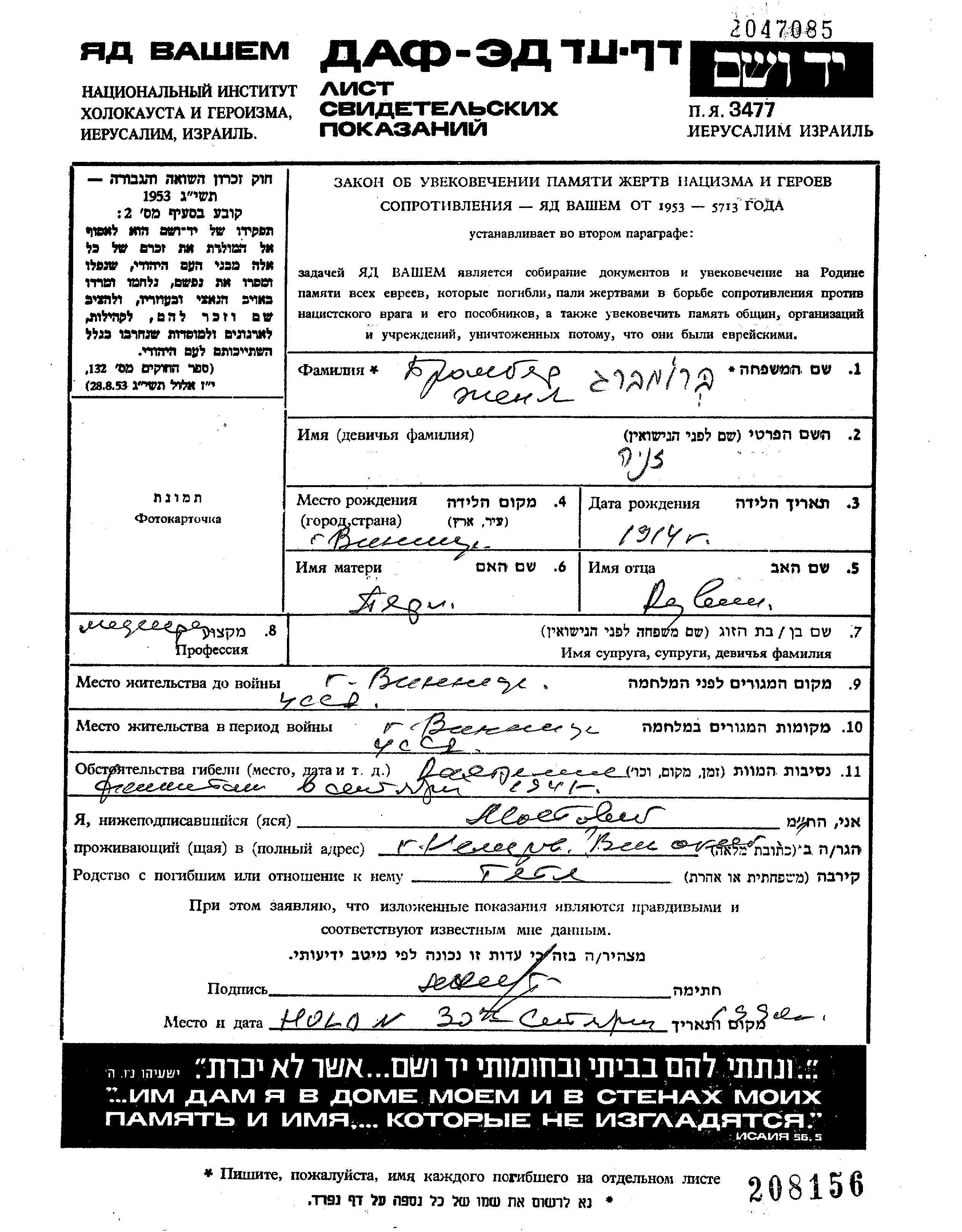 Bromberg Zhenia 1914 Vinnitsa, Ukraine (USSR) Page of Testimony