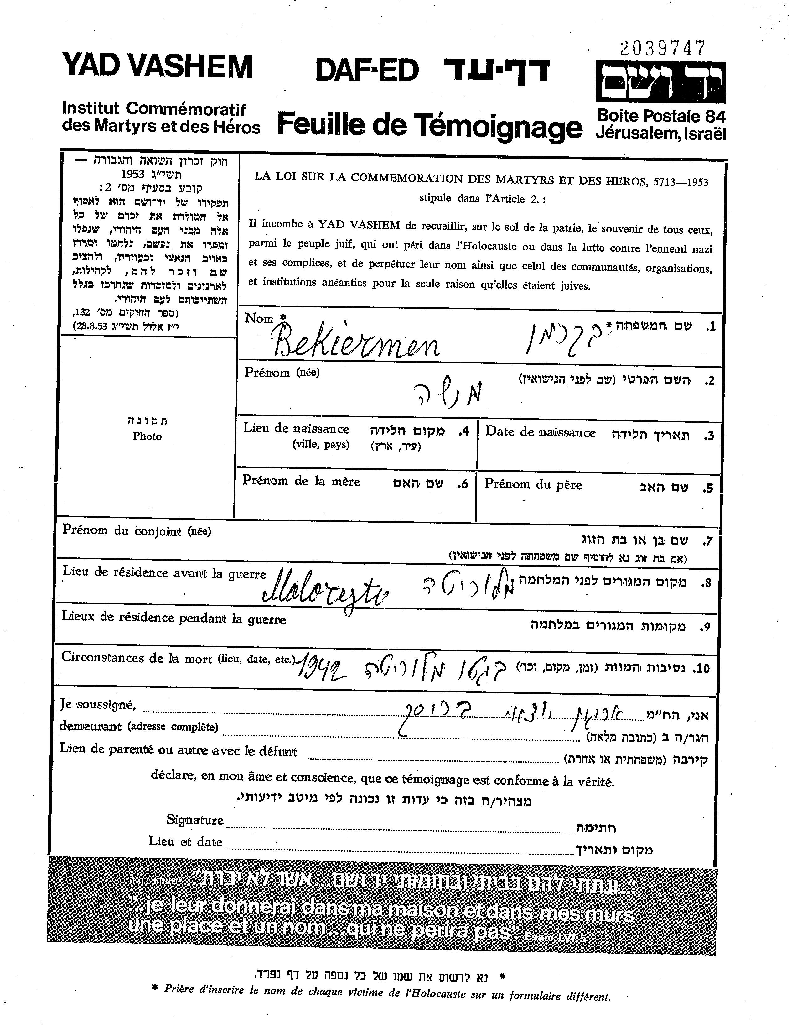 Bekiermen Moshe Maloryta, Poland Page of Testimony