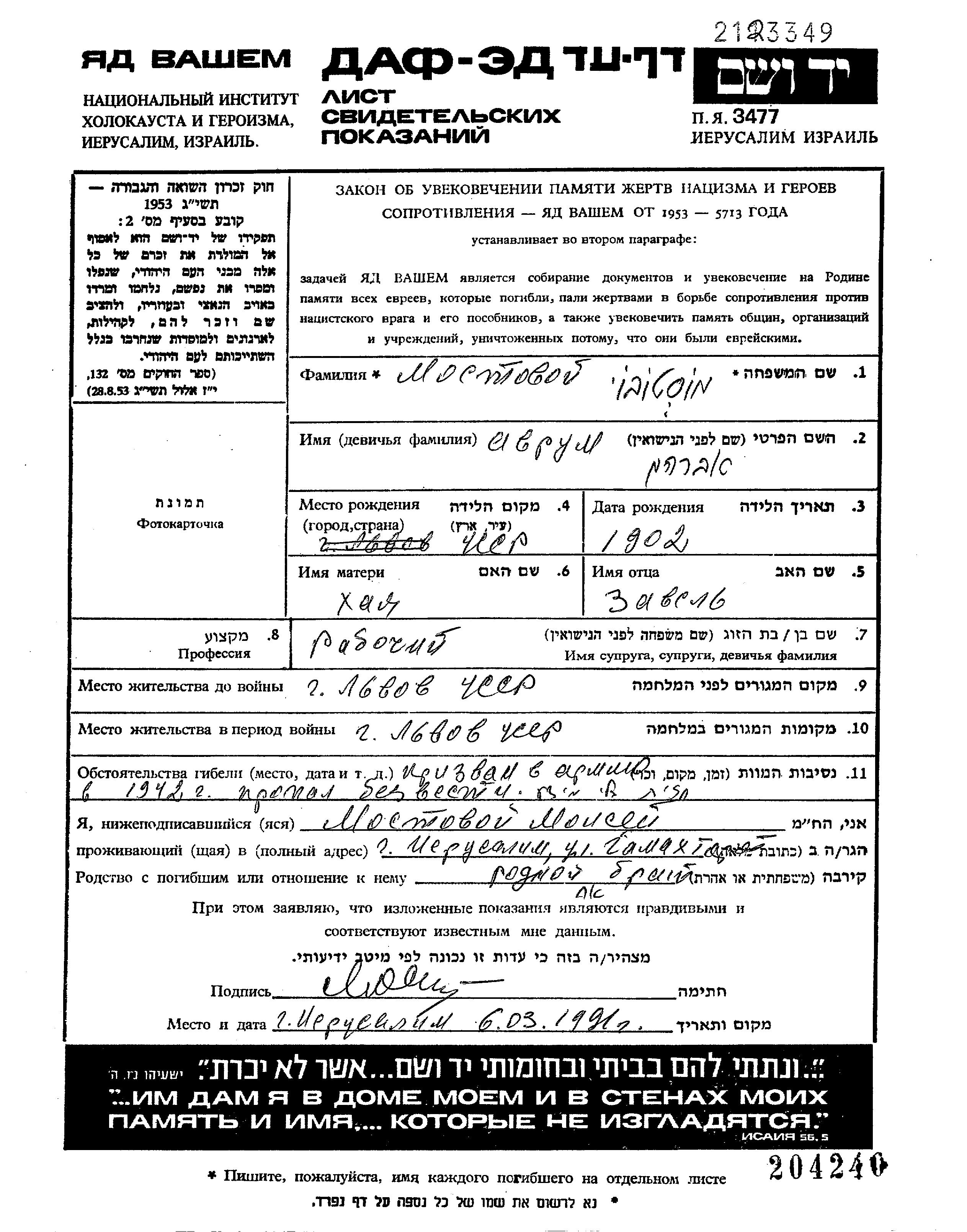 Mostovoi Avrum 1902 Lwow, Poland Page of Testimony