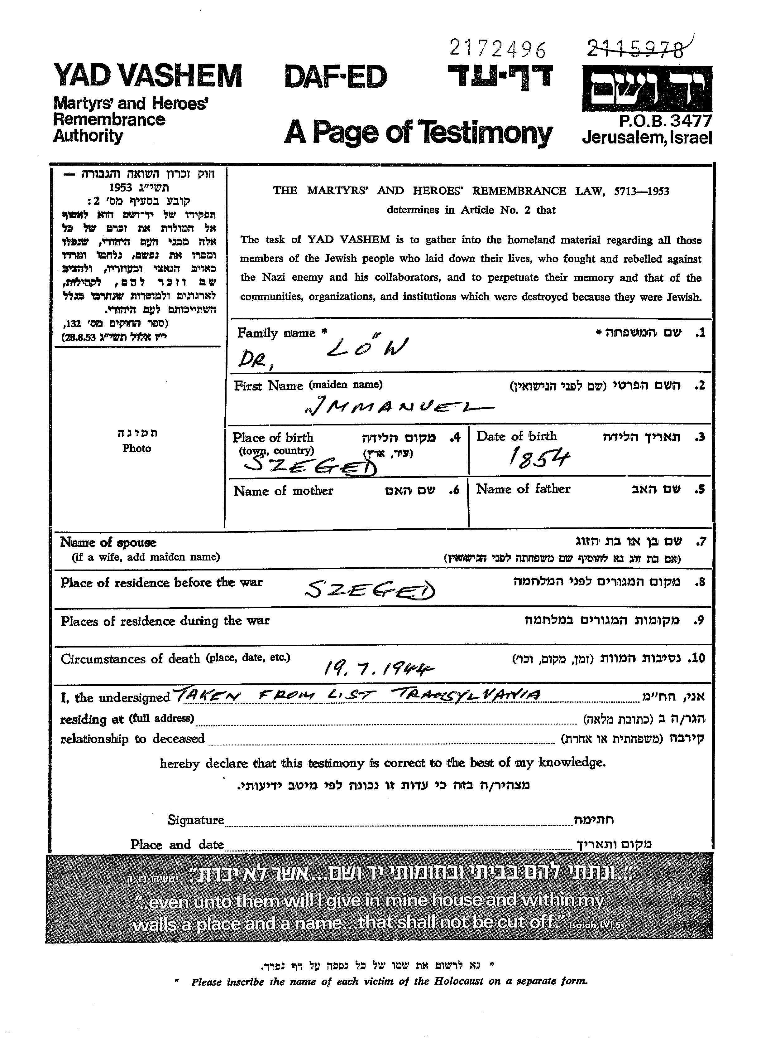 Loew Immanuel 1854 Szeged, Hungary Page of Testimony