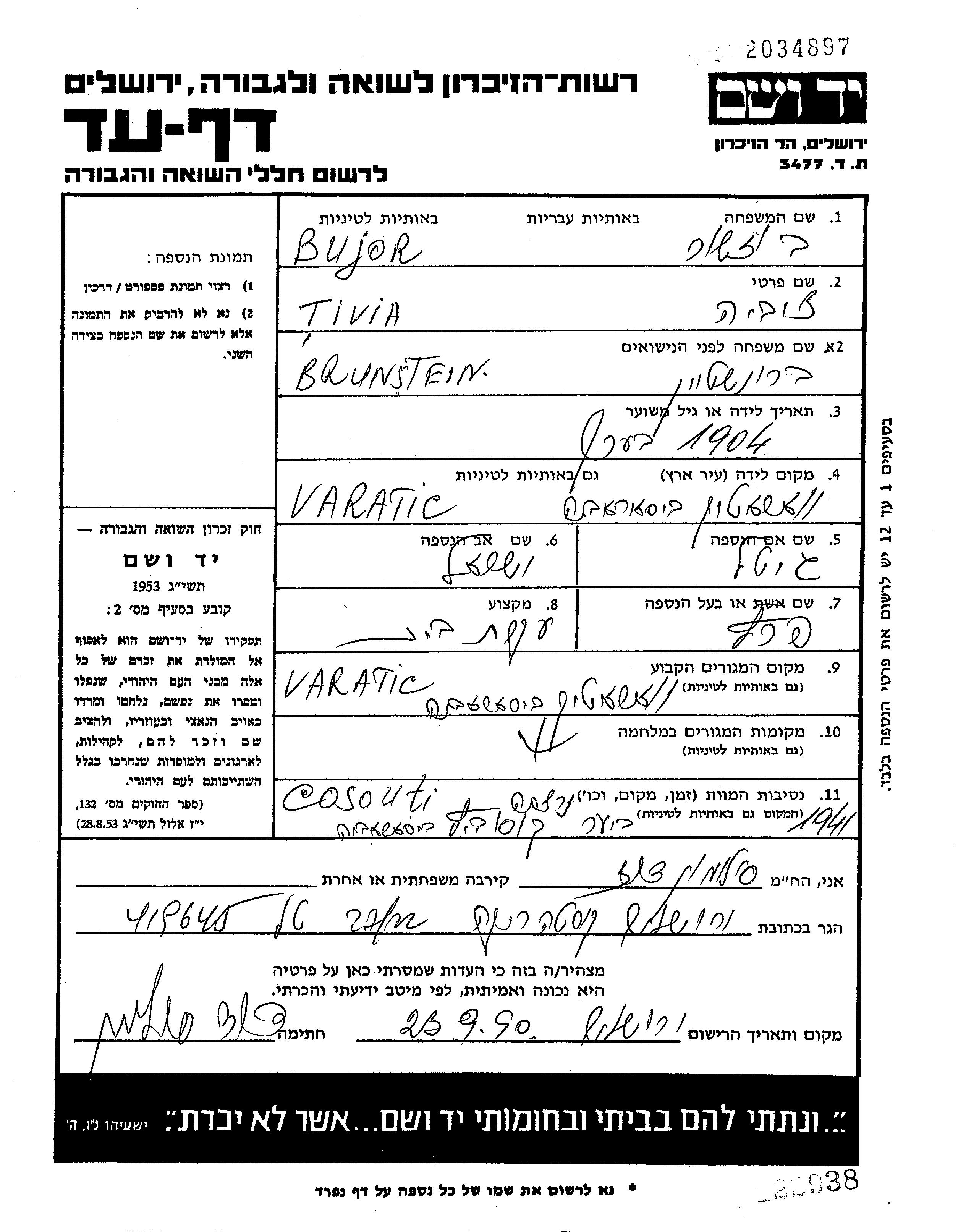 Bujor Tzvia 1904 Varatic, Romania Page of Testimony