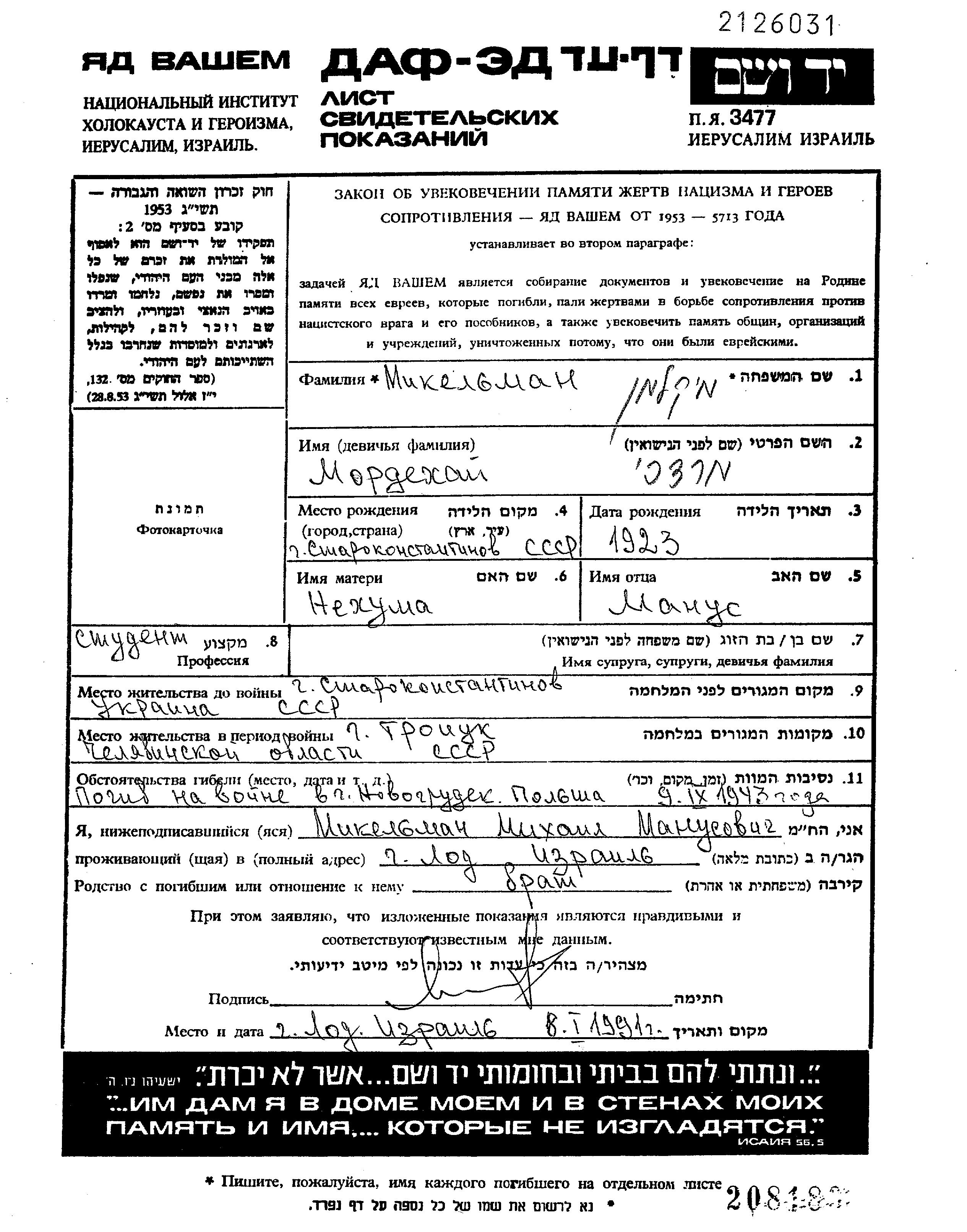 Mordekhai Mikelman was born in Staro Konstantinov, Ukraine (USSR), 1923 to Manus and Nekhuma. He was a student and single. Prior to WWII he lived in Staro Konstantinov, Ukraine (USSR). During the war he was in Troitsk, Russia (USSR). Mordekhai was killed in military service in WWII. Place of death: Nowogrodek, Poland, 09/09/1943.