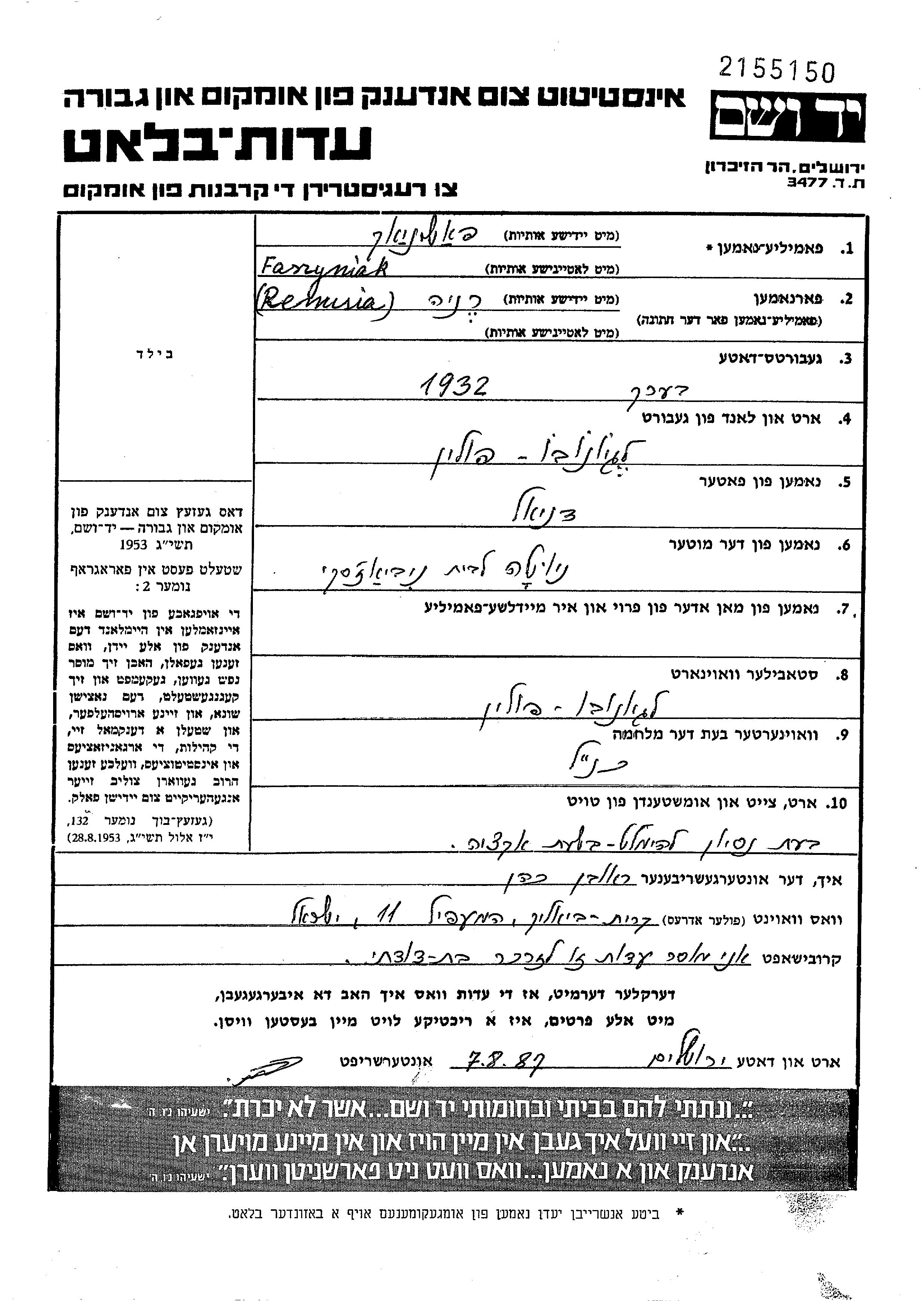 Renusia Faszyniak was born in Legionowo, Poland, 1932 to Daniel and Niuta nee Niewiazski. She was child. Prior to WWII she lived in Legionowo, Poland. During the war she was in Legionowo, Poland. Renusia was murdered in the Shoah. Place of death: Legionowo, Poland.