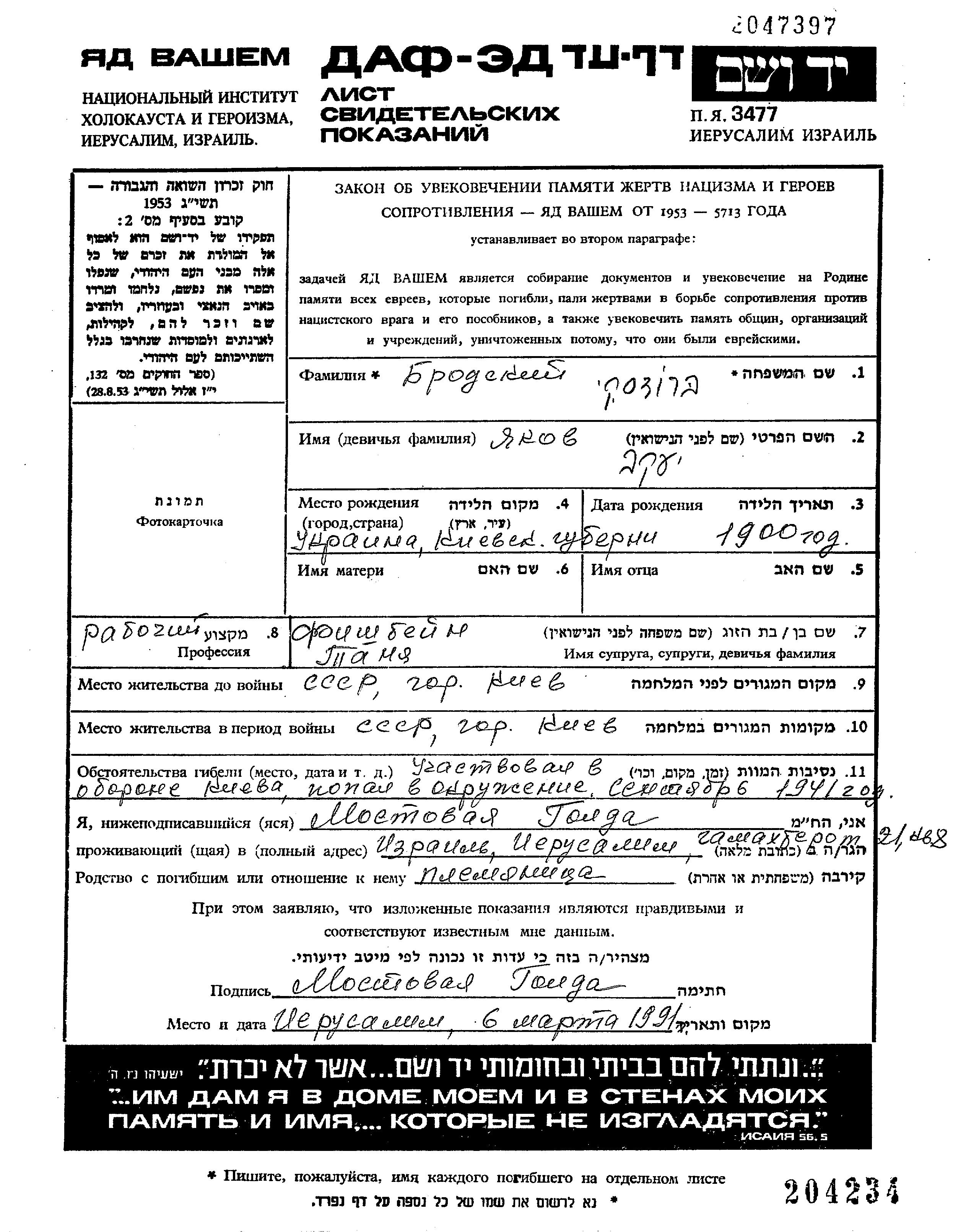 Brodsky Yakov 1900 Kiyev, Ukraine (USSR) Page of Testimony