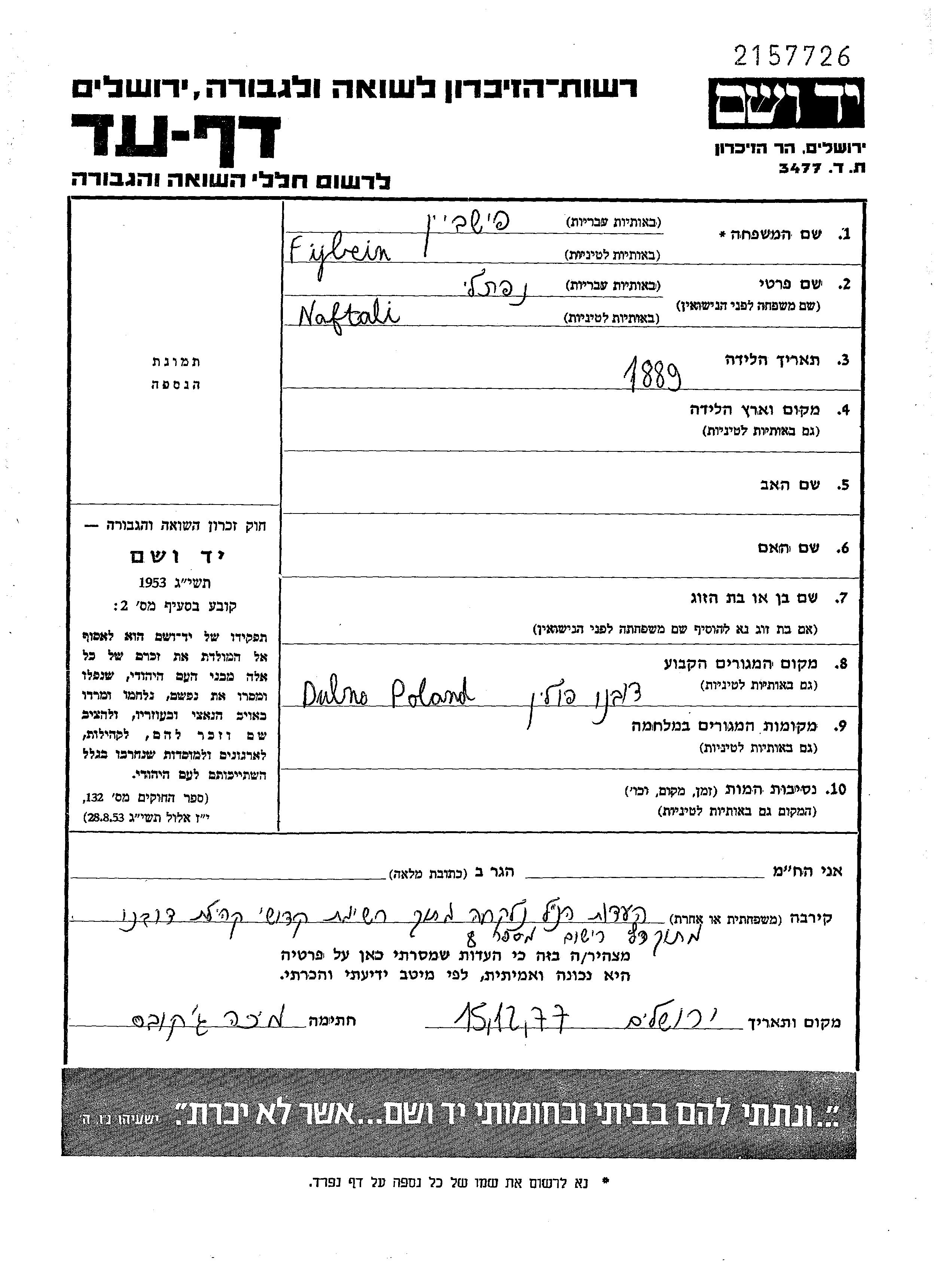 Fijbein Naftali 1889 Dubno, Poland Page of Testimony