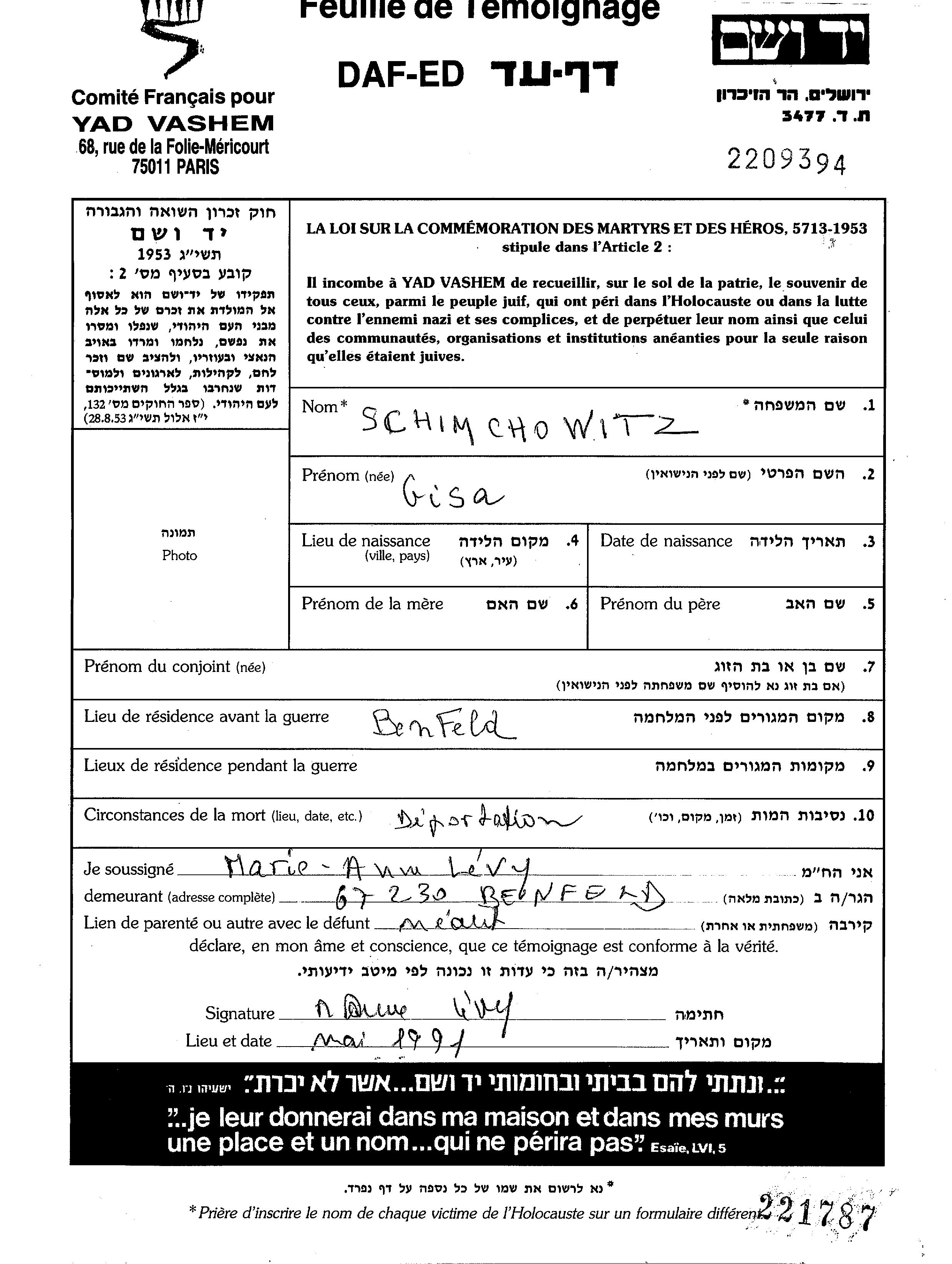 Schimchowitz Giza Gisa Benfeld, France Page of Testimony