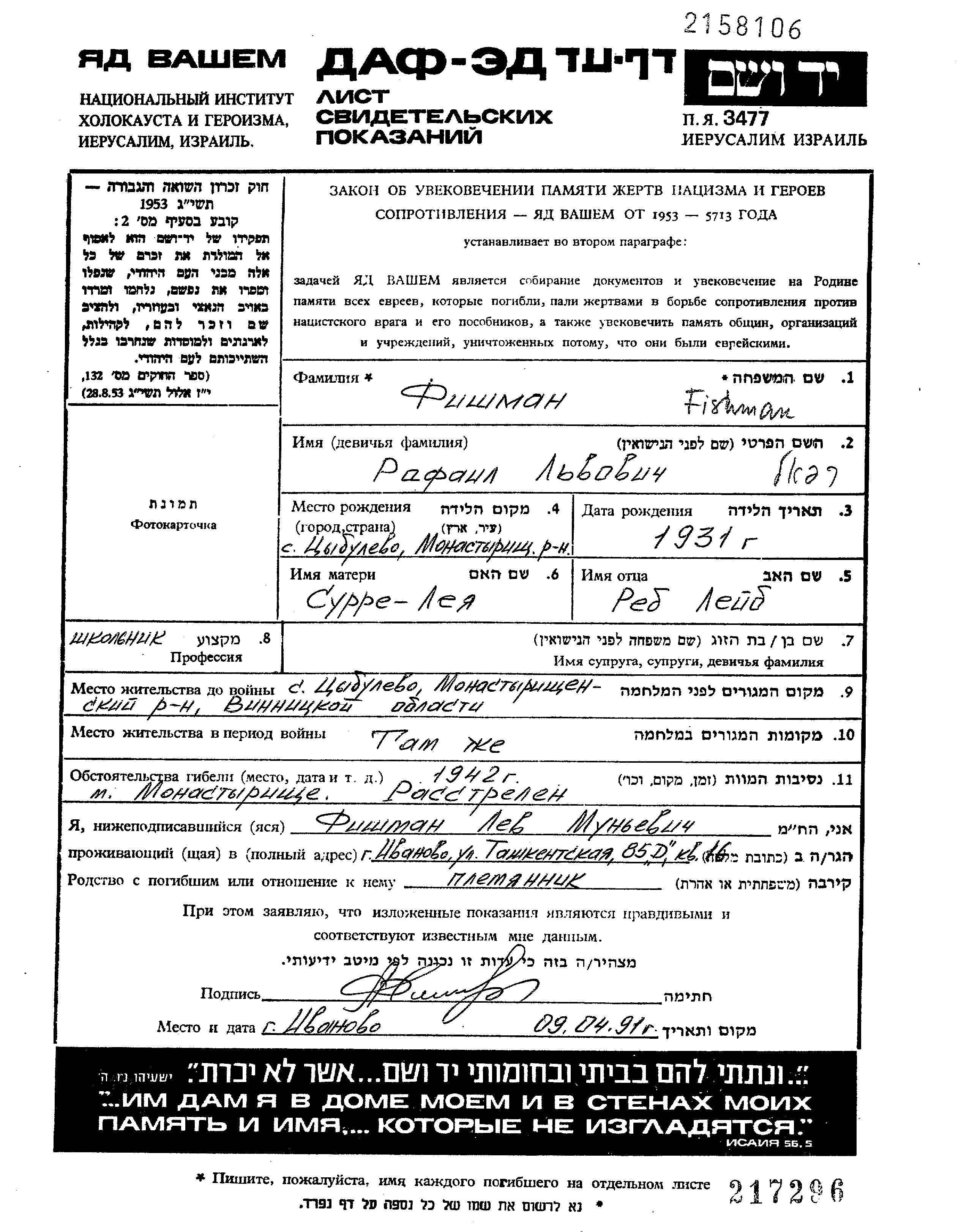 Rafail Fishman was born in Tsibulev, Ukraine (USSR), 1931 to Leib and Surre Leya. He was a pupil and child. Prior to WWII he lived in Tsibulev, Ukraine (USSR). During the war he was in Tsibulev, Ukraine (USSR). Rafail was murdered in the Shoah. Place of death: Monastyrishche, Ukraine (USSR), 1942.