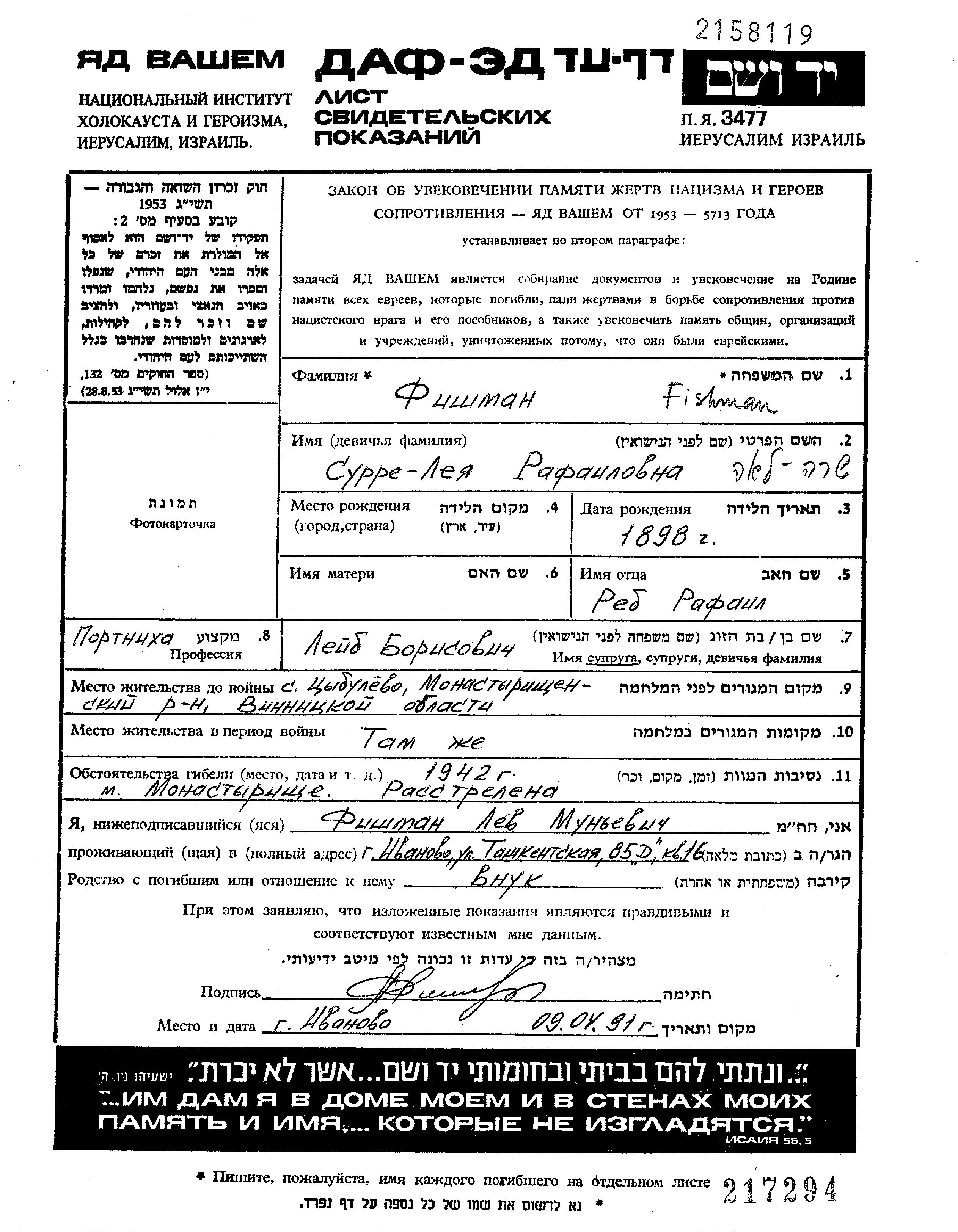 Surre Leya Fishman was born, 1898 to Rafail. She was a seamstress and married to Leib. Prior to WWII she lived in Tsibulev, Ukraine (USSR). During the war she was in Tsibulev, Ukraine (USSR). Surre Leya was murdered in the Shoah. Place of death: Monastyrishche, Ukraine (USSR), 1942.