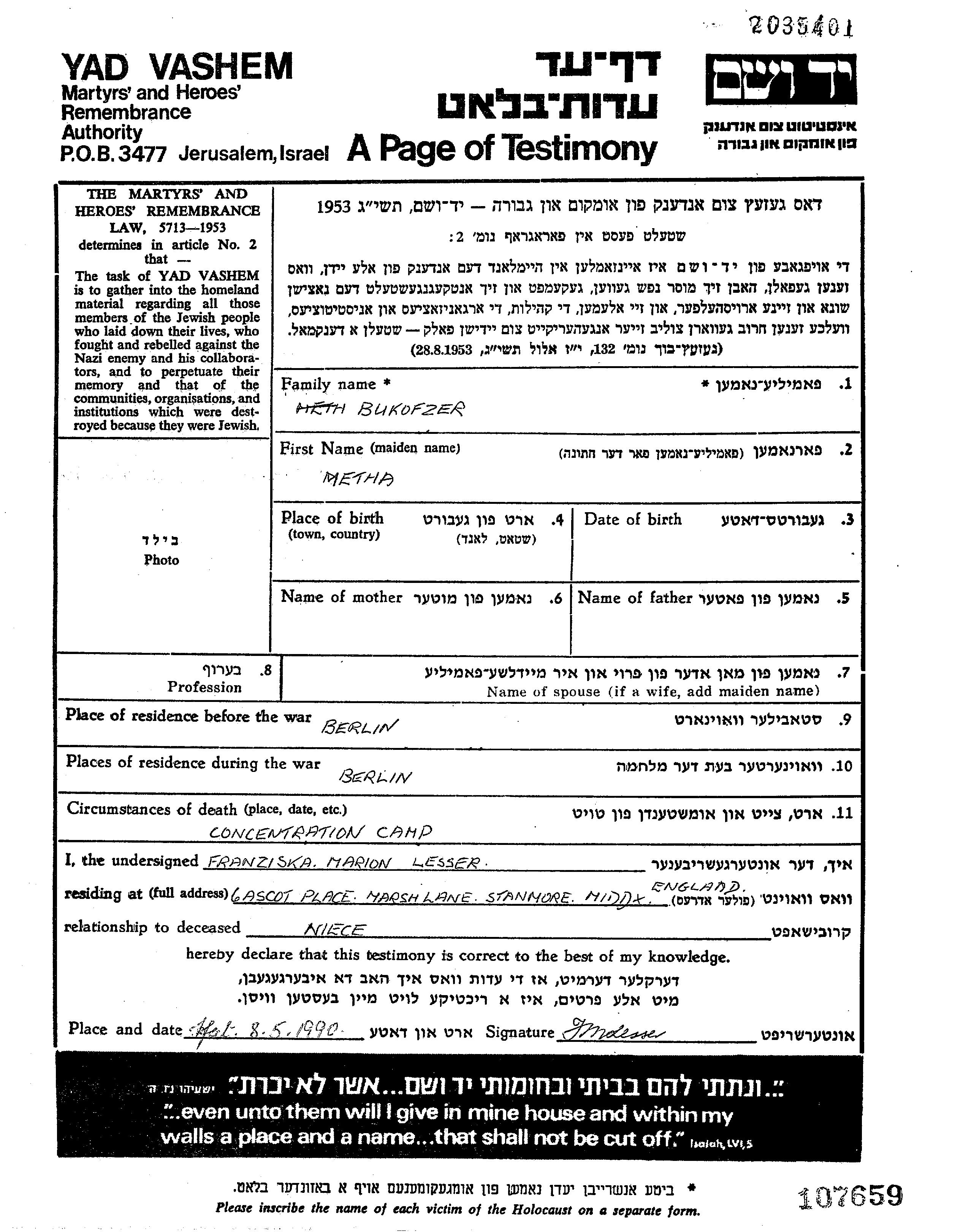Bukofzer Metha Berlin, Germany Page of Testimony