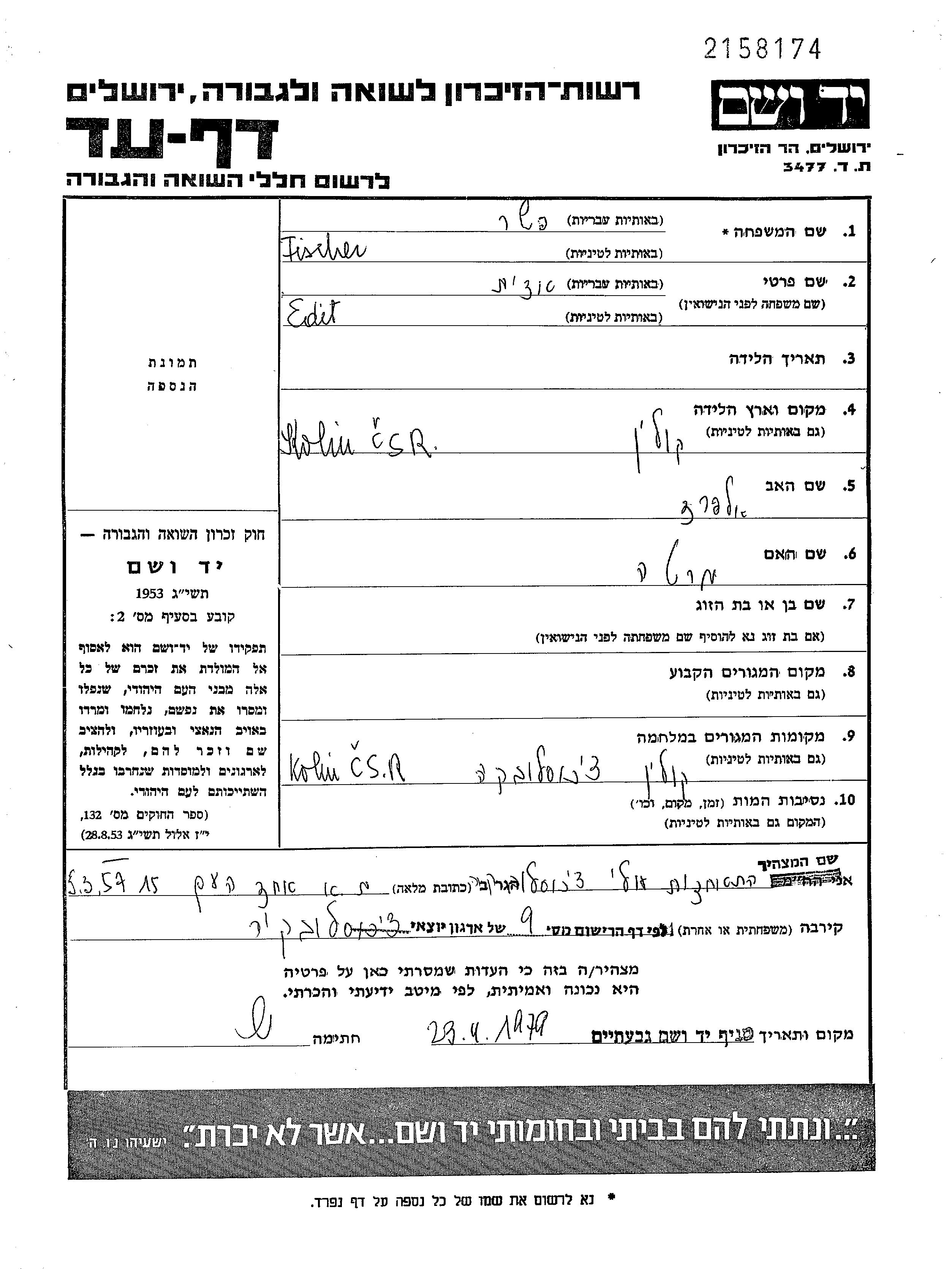 Fischer Edit Kolin, Czechoslovakia Page of Testimony