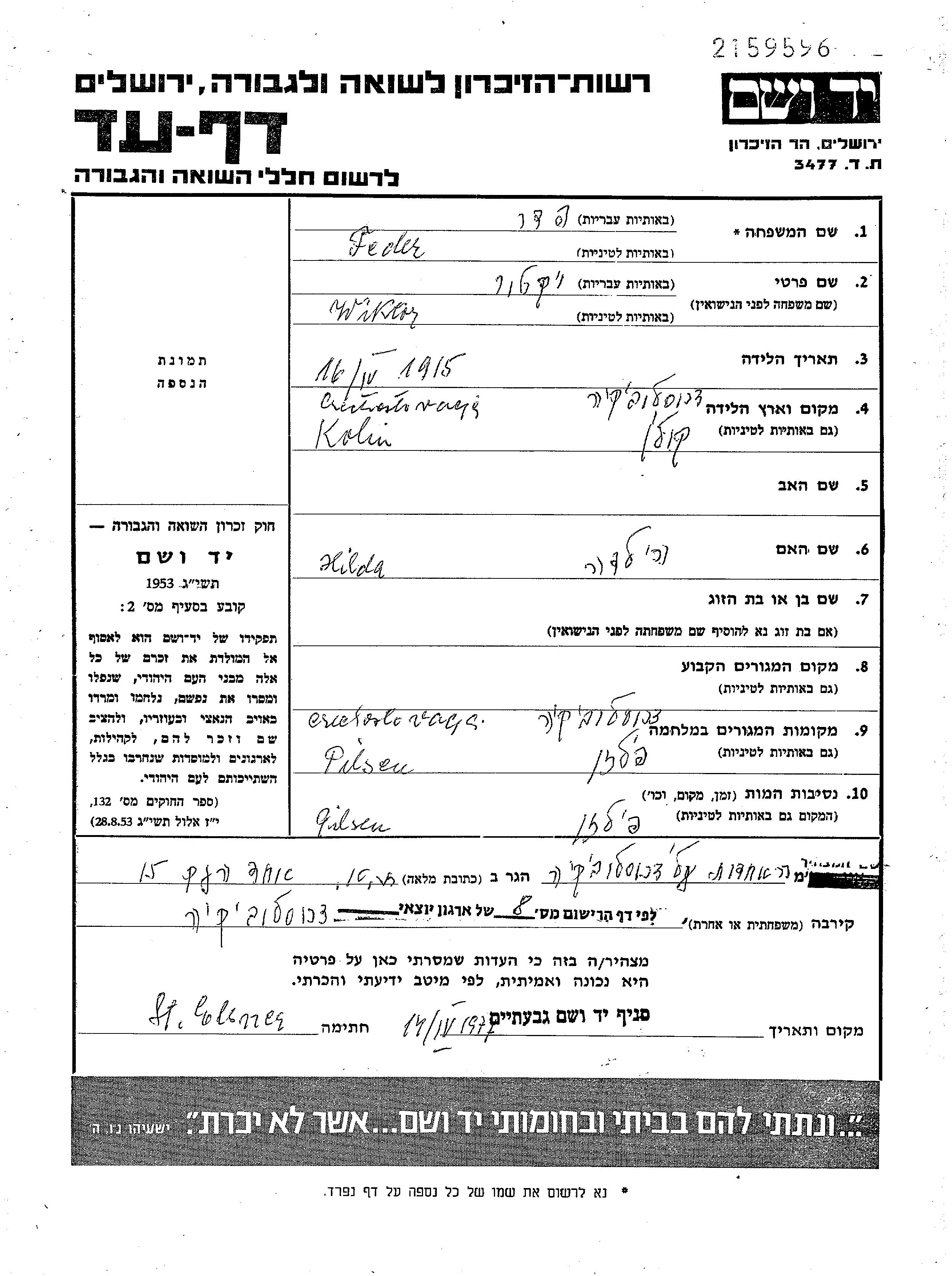 Feder Wiktor 1915 Plzen, Czechoslovakia Page of Testimony