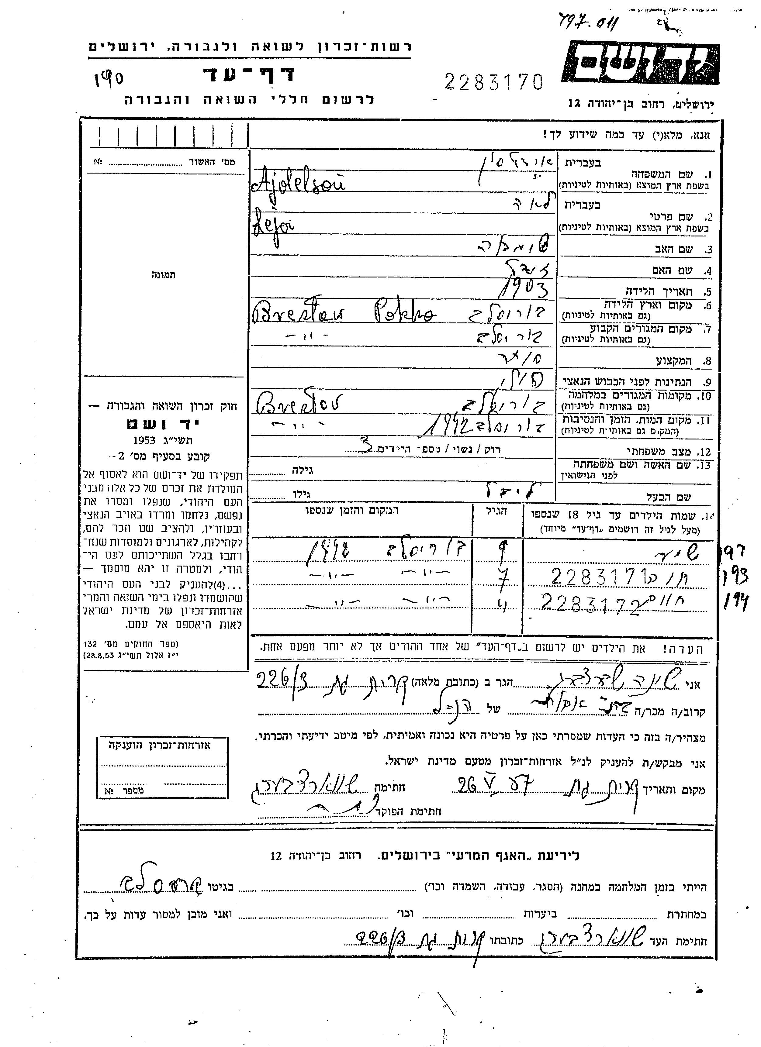 Shie Ajdelson was born in Poland, 1933 to Lejbel and Leja. He was child. Prior to WWII he lived in Breslav, Poland. During the war he was in Breslav, Poland. Shie was murdered in the Shoah. Place of death: Breslav, Poland, 1942.