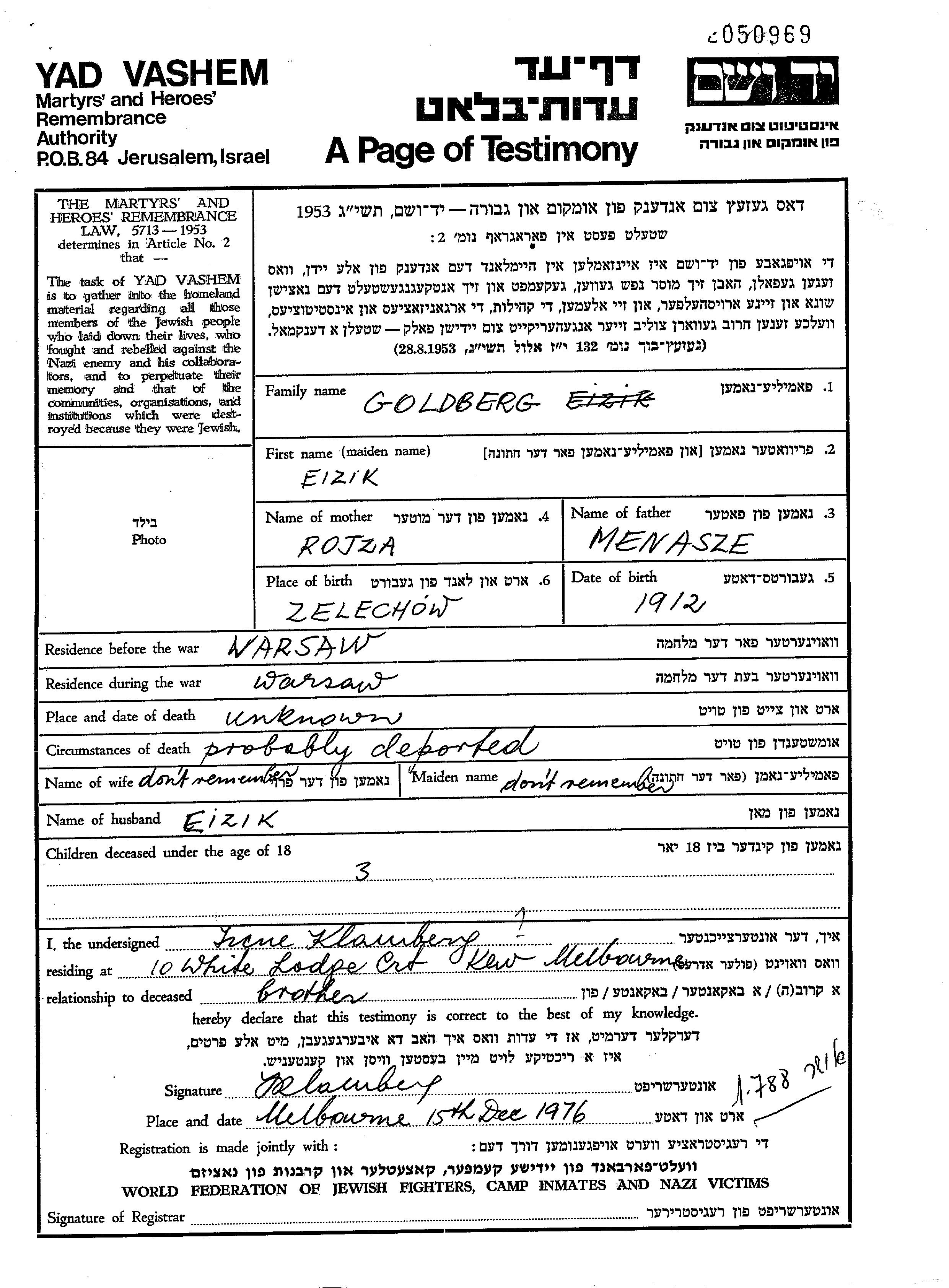 Goldberg Aizik 1912 Warszawa, Poland Page of Testimony